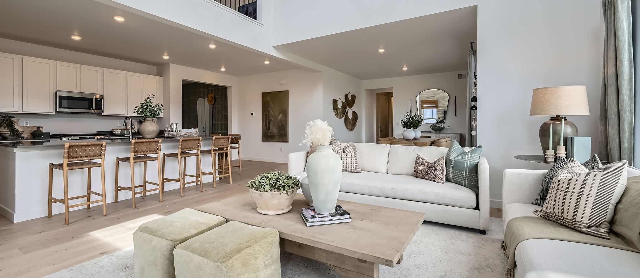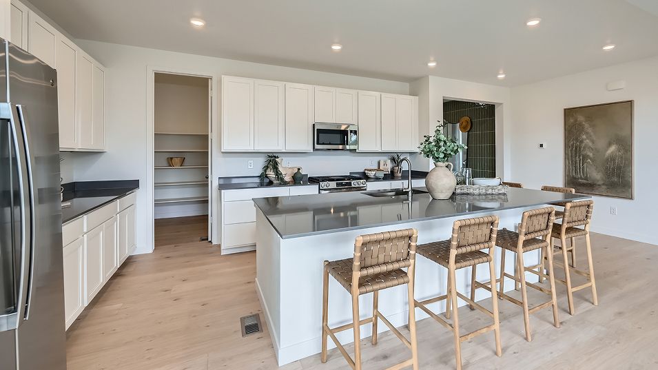 This new two-story home is a family-friendly haven. The first floor features an open-plan layout among a Great Room with double-height ceilings, a kitchen with a center island and a nook with doors to the covered deck. A secluded secondary bedroom offers added privacy. The second floor hosts a versatile loft and four bedrooms including the luxe owner’s suite.