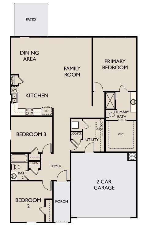 Step inside from the front porch into a foyer that leads to two bedrooms and a full bath at the front of the home. A linen closet and laundry room are located just off the hallway for added functionality. At the heart of the home, the kitchen opens to the dining area and family room, creating a spacious main living space. The primary bedroom is located at the back and features a walk-in closet and a primary bath. A rear patio is accessible from the dining area, and the two-car garage connects to the home through a hallway near the laundry room.