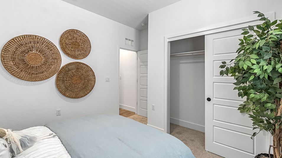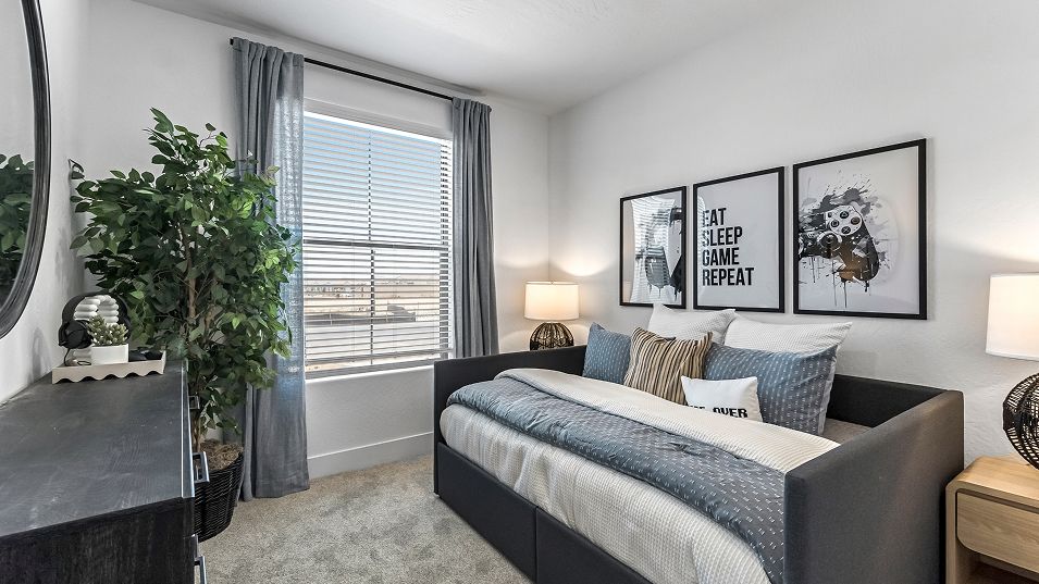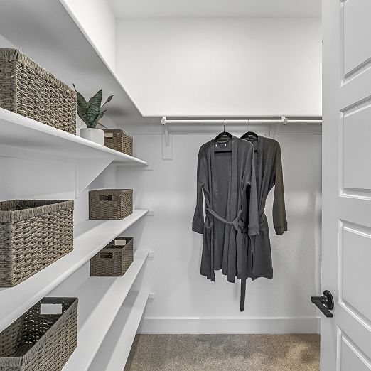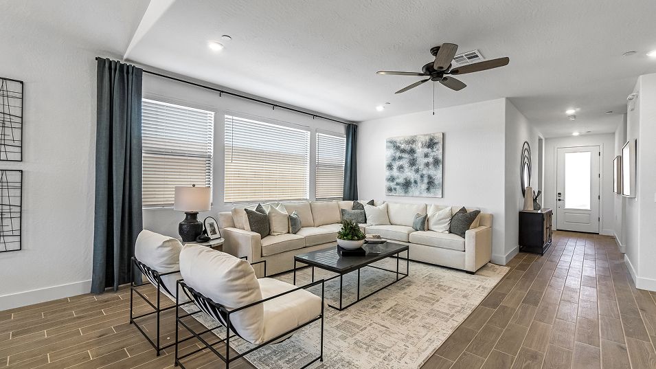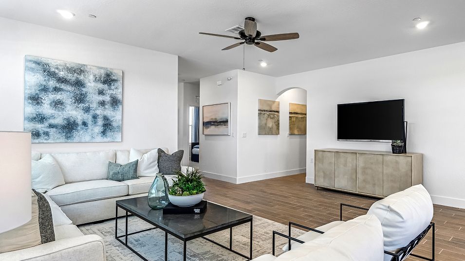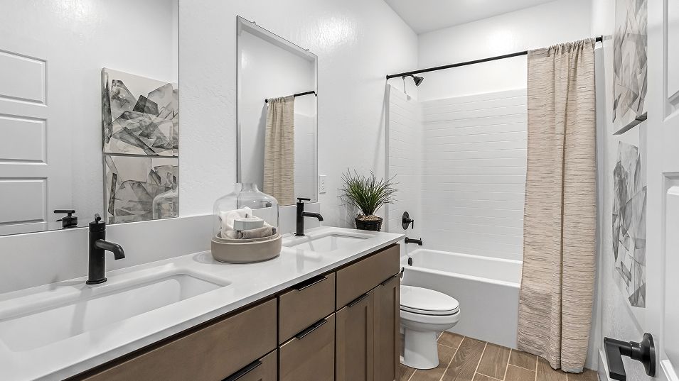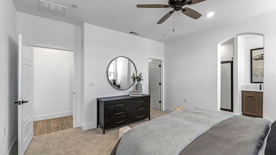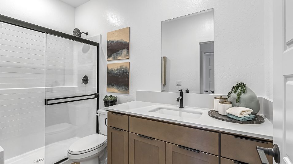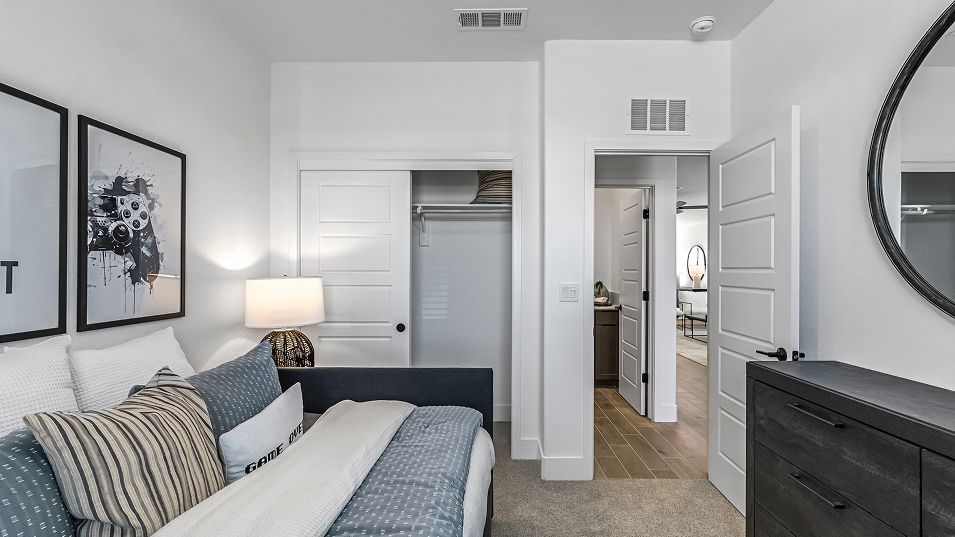 This new single-story home features three secondary bedrooms off the entry, leading to an open layout consisting of the kitchen, dining room and Great Room for seamless everyday transitions. Two additional bedrooms are tucked away to the side of the home, with the owner’s suite nestled into a private corner with a spa-inspired bathroom and walk-in closet. A two-bay garage completes the home.