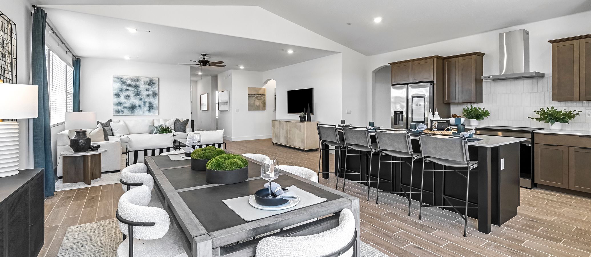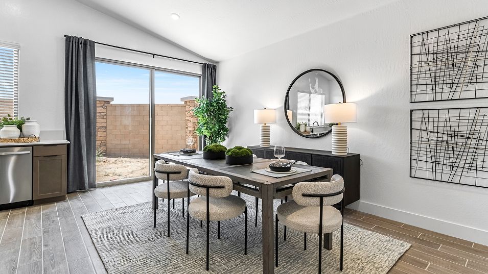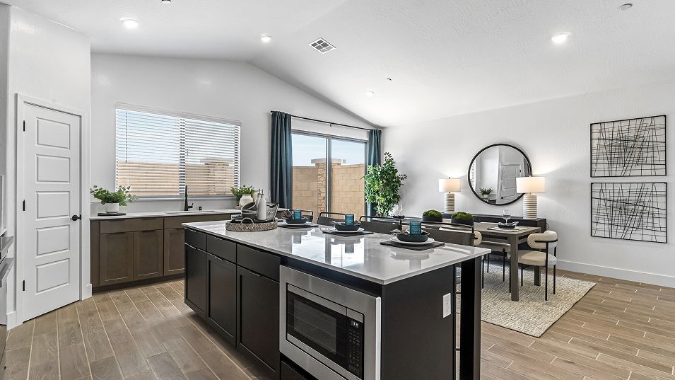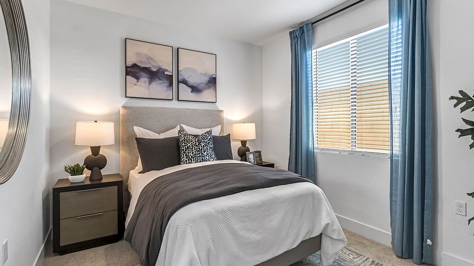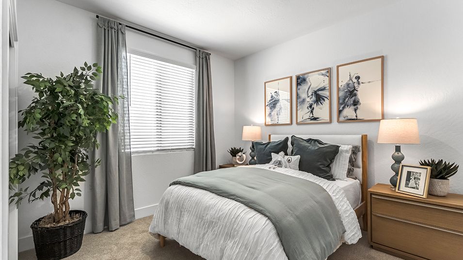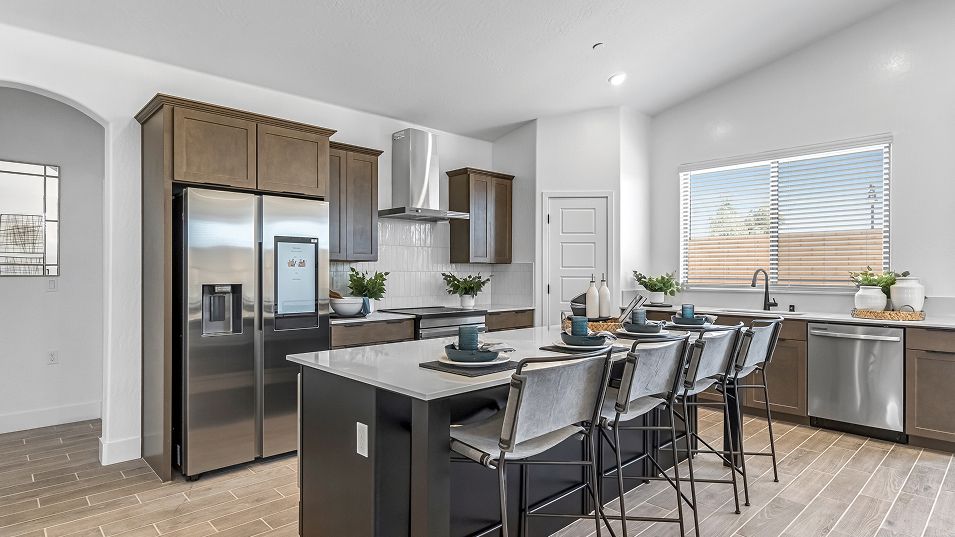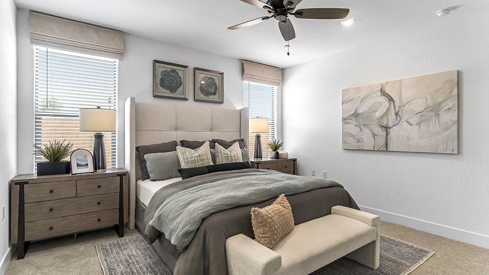 This new single-story home features three secondary bedrooms off the entry, leading to an open layout consisting of the kitchen, dining room and Great Room for seamless everyday transitions. Two additional bedrooms are tucked away to the side of the home, with the owner’s suite nestled into a private corner with a spa-inspired bathroom and walk-in closet. A two-bay garage completes the home.