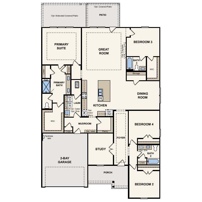 The desirable Bradbury single-level floor plan offers an expansive living space, centered around an airy great room with quick access to the well-equipped kitchen, complete with center island and comfortable dining room. The floorplan features a luxurious primary suite, complete with walk-in shower, dual vanities, and a spacious walk-in closet. Three more bedrooms and a study round out the floorplan. Options include a covered patio and a primary suite bathtub to accompany the shower.