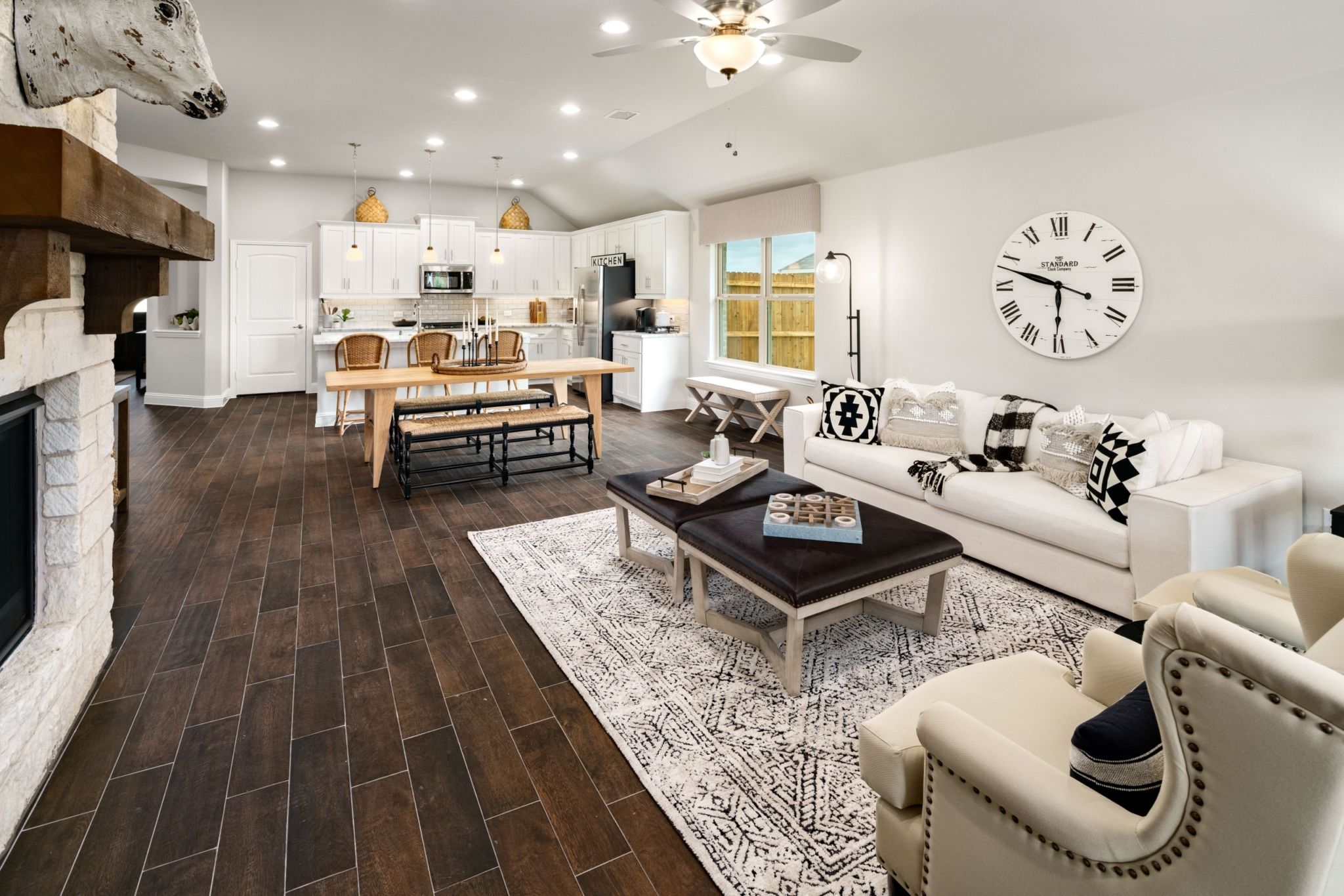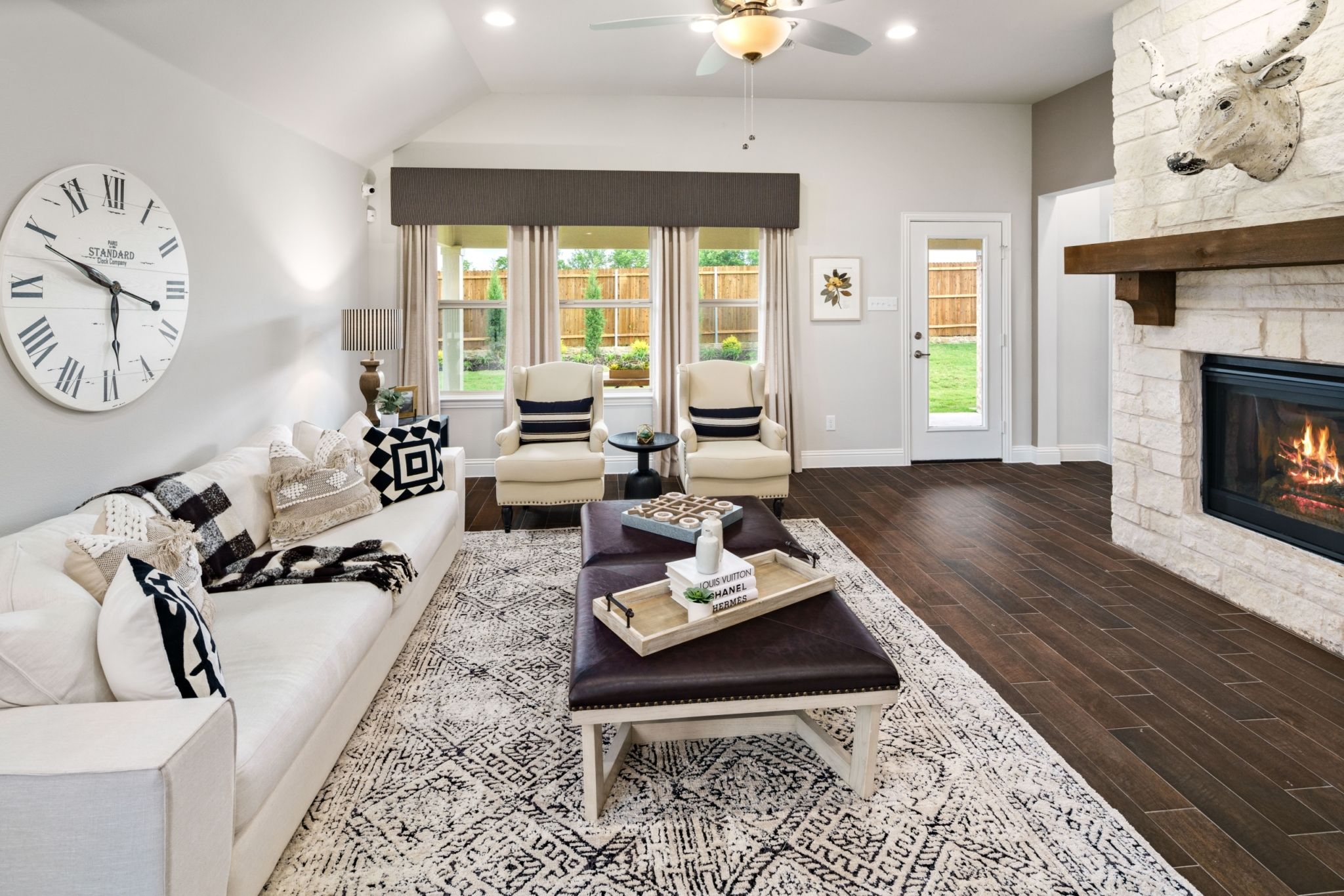 The Brazos offers a well-designed single-story layout that blends modern comfort with open-concept living. A welcoming covered front porch opens into a spacious great room with direct access to a rear covered patio—ideal for indoor-outdoor entertaining. The gourmet kitchen features a large center island with breakfast bar seating, a walk-in pantry, and convenient access to the dining area—perfect for both everyday meals and formal gatherings. The private primary suite includes a generous walk-in closet and a luxurious en suite bath with dual vanities, a soaking tub, separate walk-in shower, and linen storage. Two large secondary bedrooms share a full bathroom, while a centrally located utility room adds practical convenience.