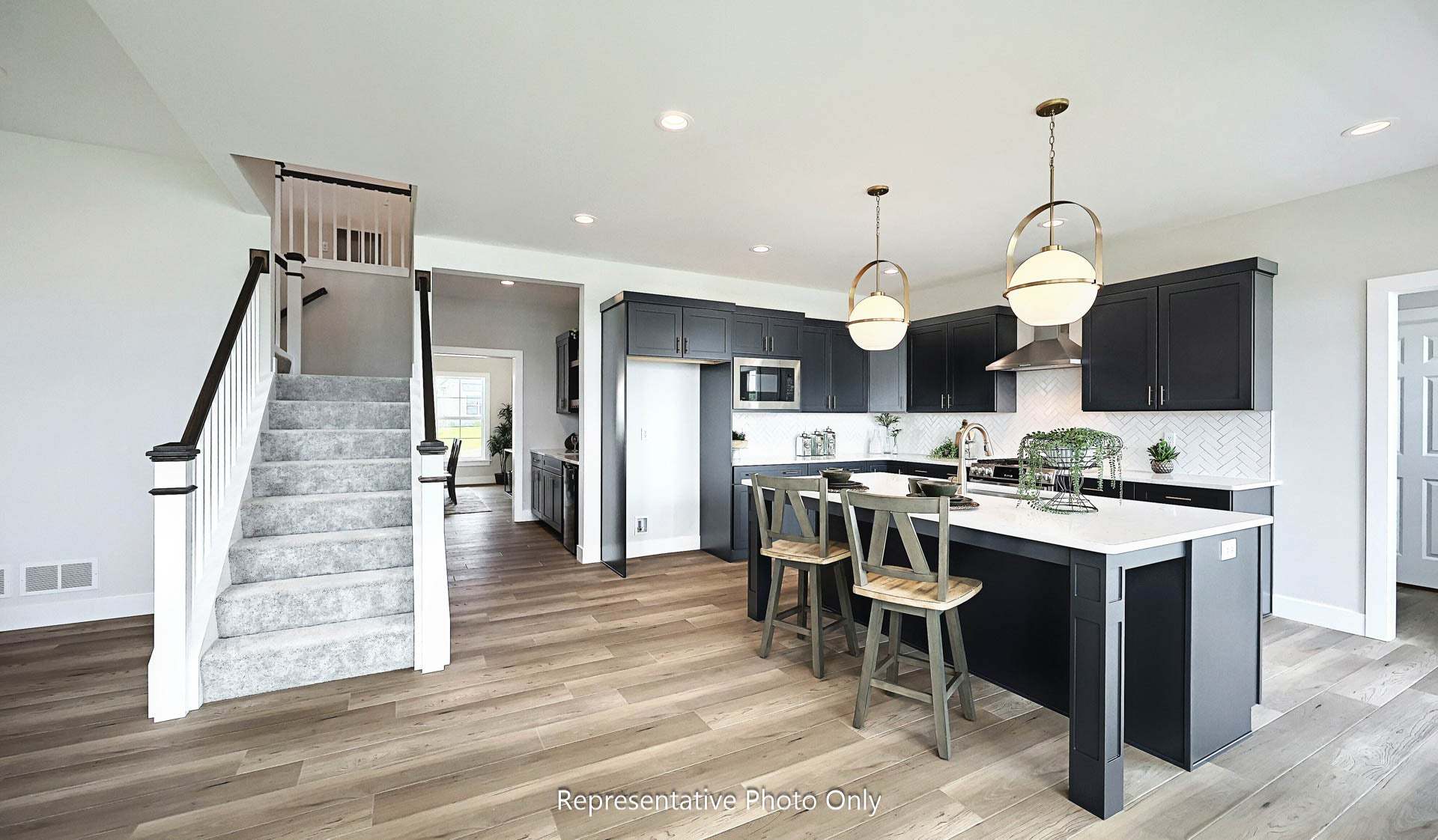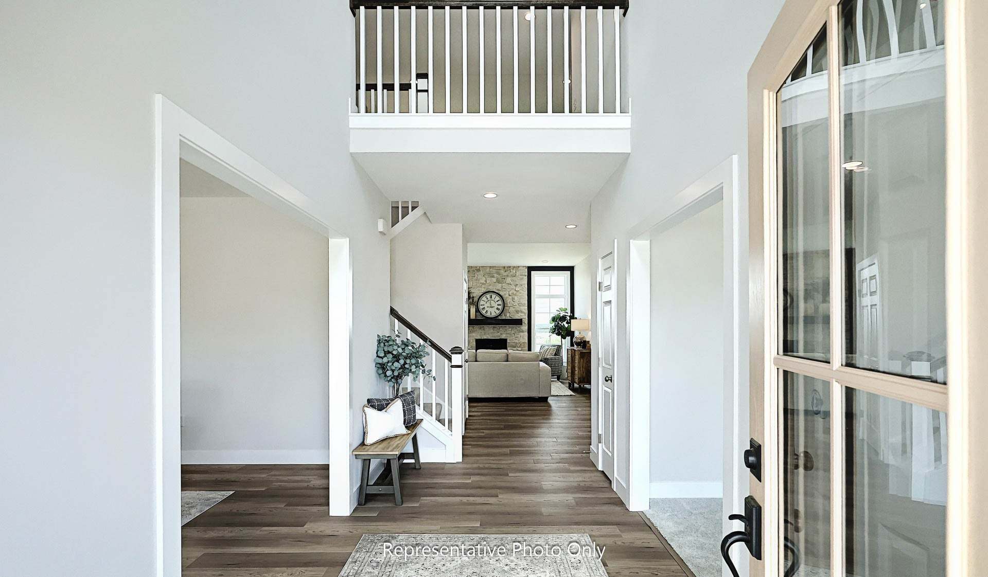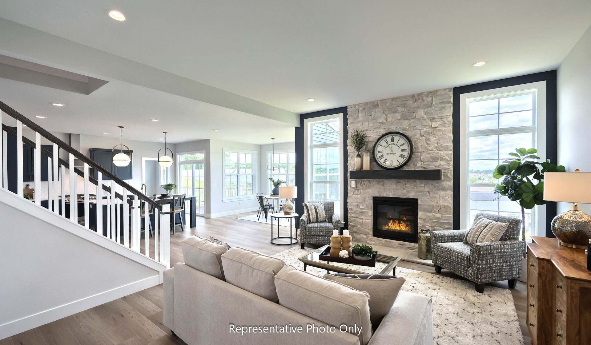 Grand entry and convenient staircase accessing both foyer and kitchen. Sweeping kitchen design allows you to cook and admire the fireplace at the same time. Off of the kitchen is a mud room, powder room and spacious closet. Dining room and living room to the front of the home. First floor office/study off of the great room.