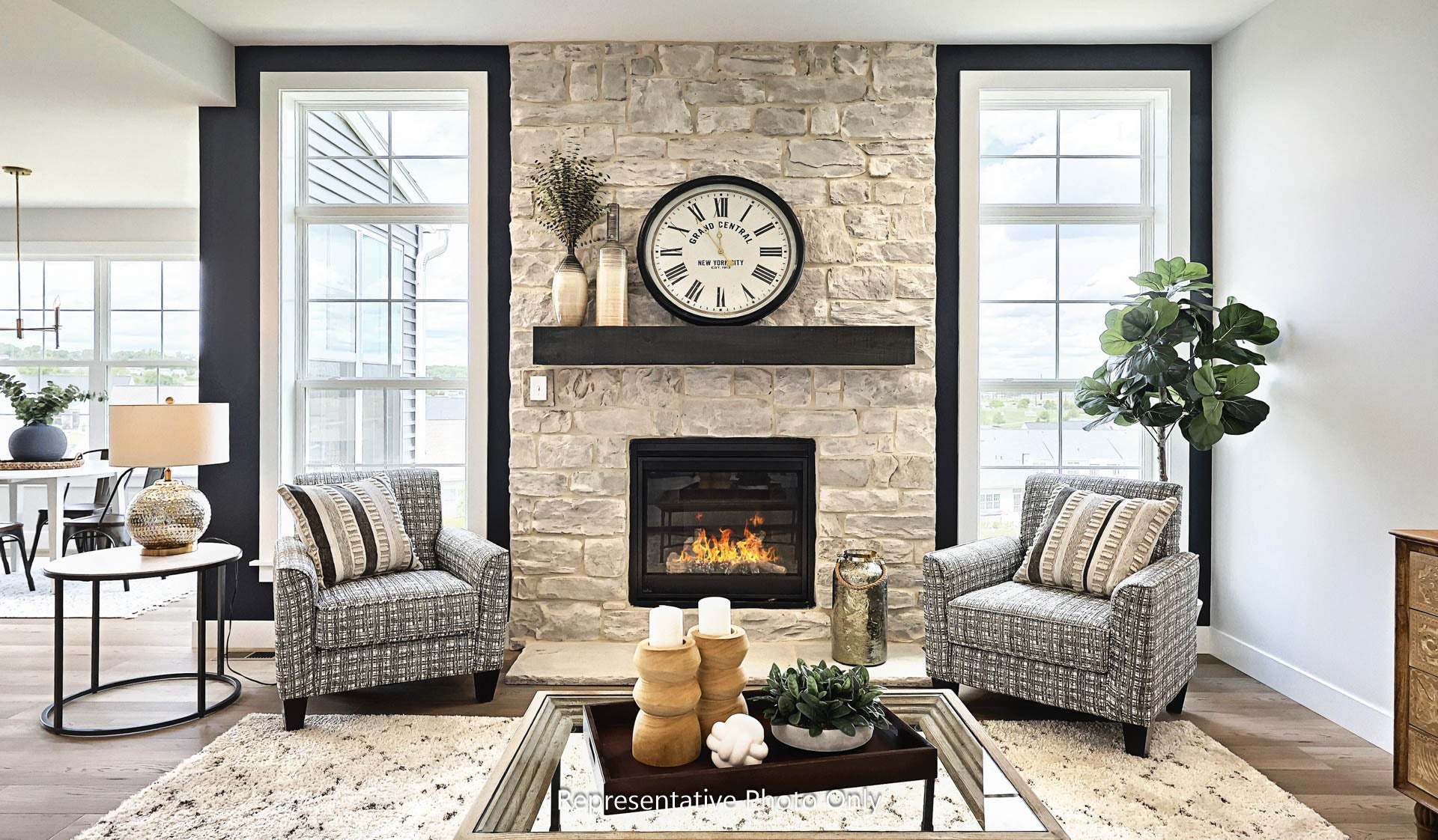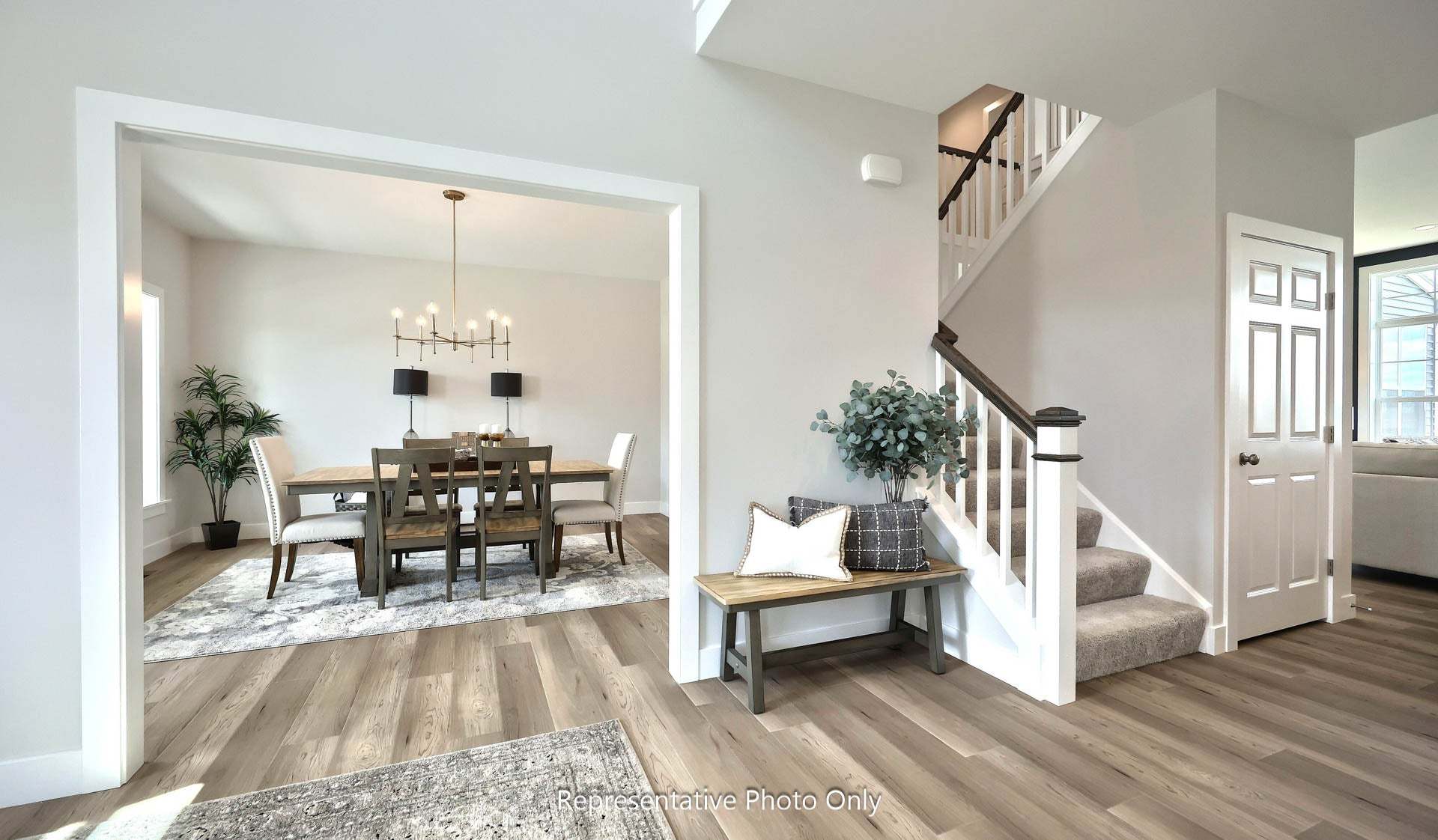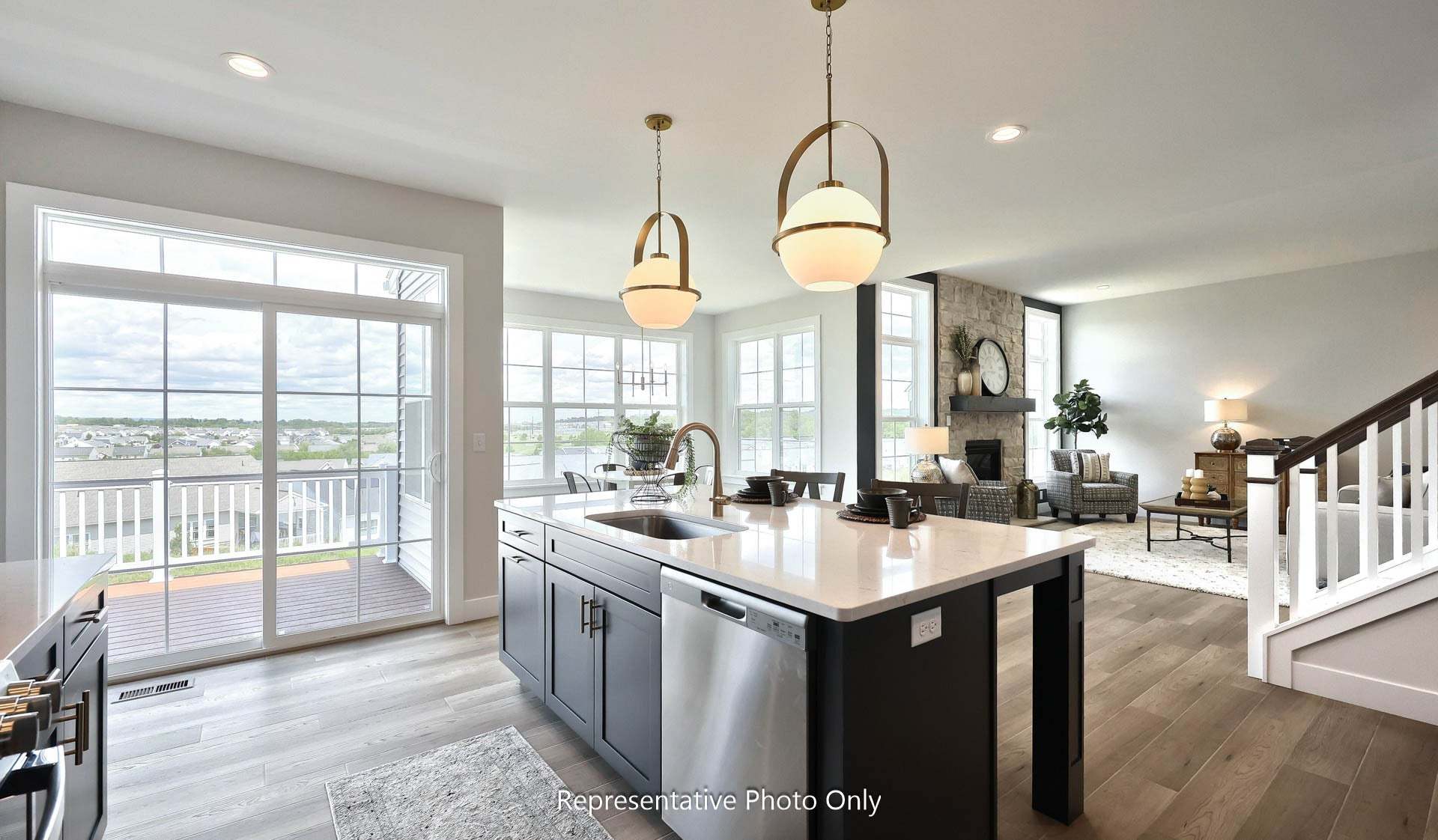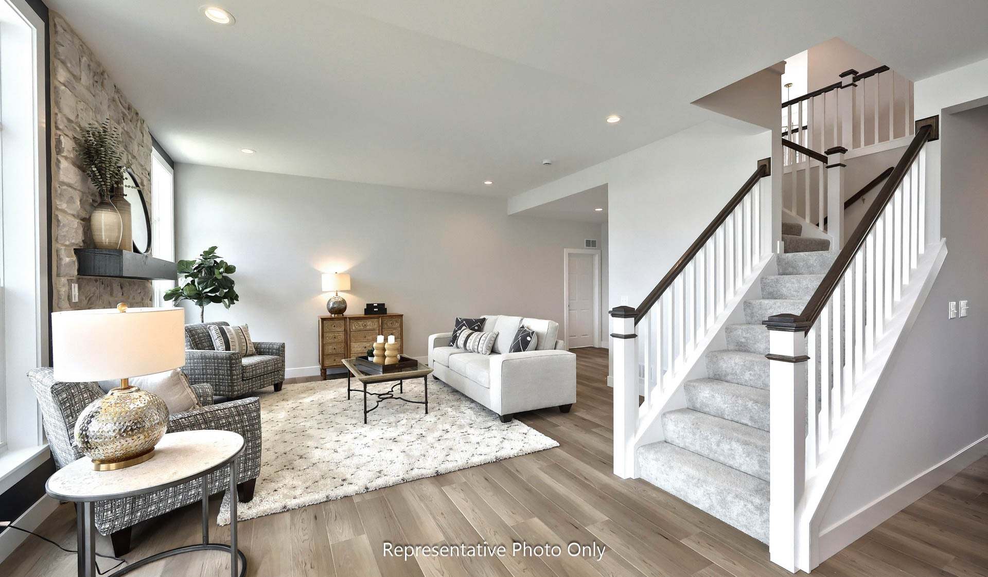 Grand entry and convenient staircase accessing both foyer and kitchen. Sweeping kitchen design allows you to cook and admire the fireplace at the same time. Off of the kitchen is a mud room, powder room and spacious closet. Dining room and living room to the front of the home. First floor office/study off of the great room.