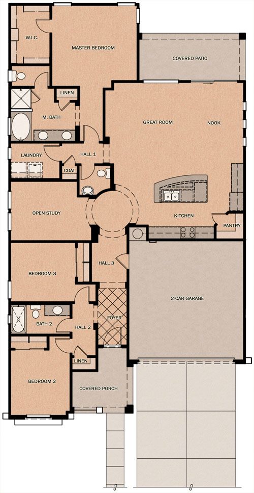 The Cavacade is the largest single level home at Seaboard with almost 1900 square feet. It features a two car garage, 3 bedrooms plus open study, covered patio and front porch. The center rotunda is the highlight of this popular plan.