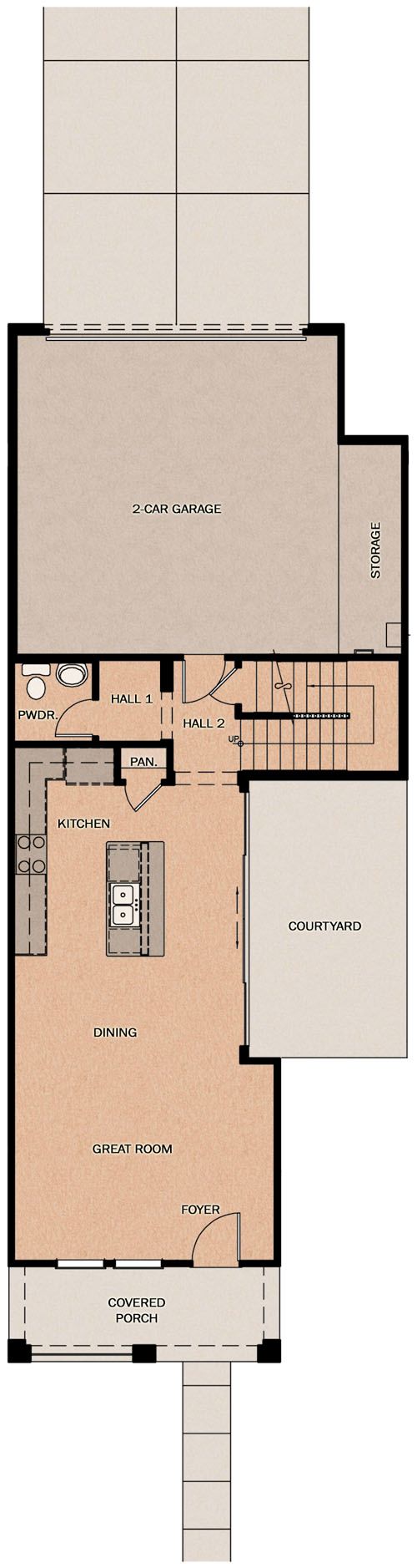 The Coconino is a 1602 square foot two story home with 3 bedrooms, 2 1/2 baths, a courtyard and a two car alley loaded garage with extra storage.The HERS rating is 42.