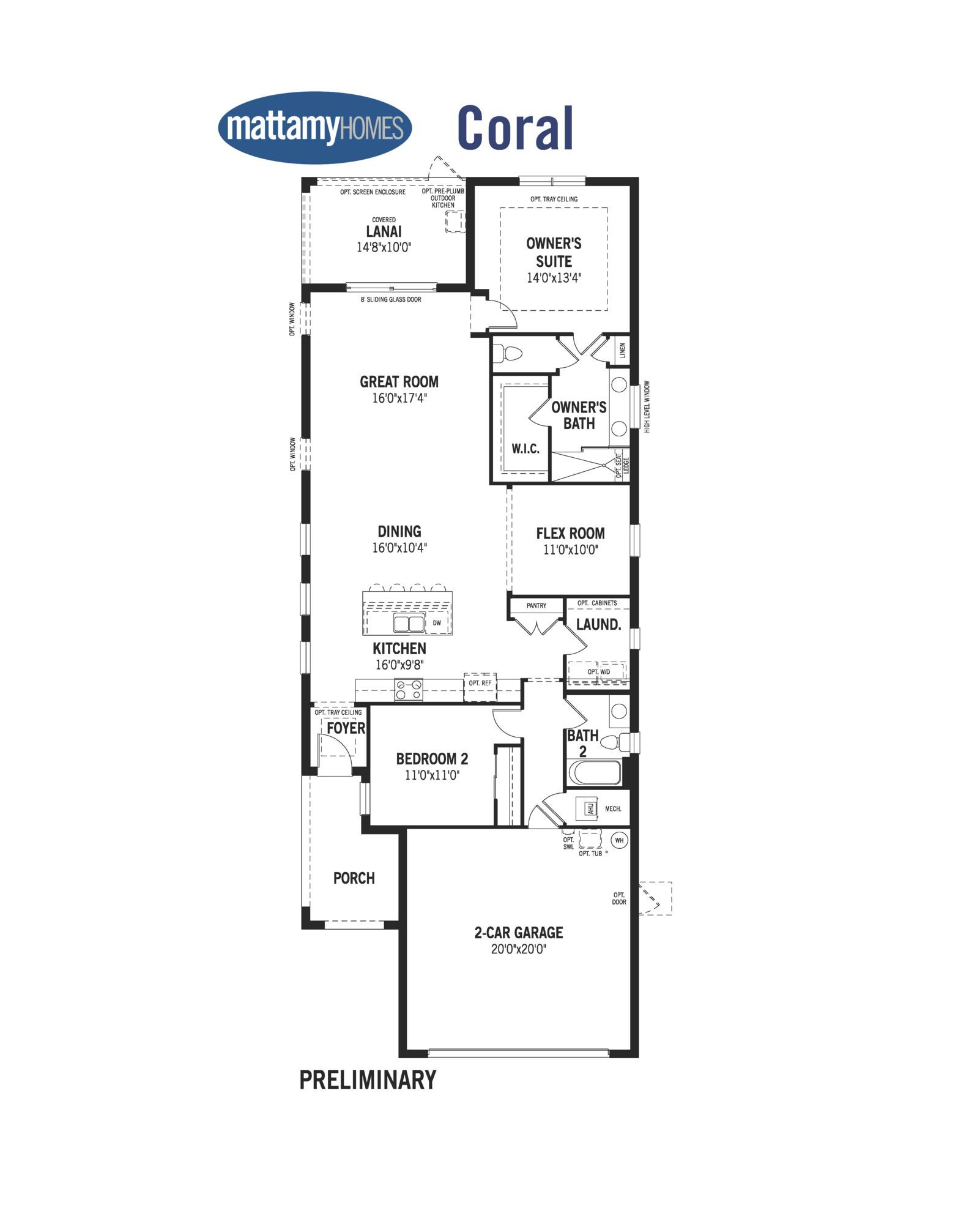 The Coral is a single-family home design with 1,611 sq. ft. of open and airy living space. The layout has plenty of natural light and timeless, modern styling to make both your everyday living and special gatherings brilliant and memorable. The designer-coordinated kitchen, dining area, and Great Room overlook the covered lanai. A flex room provides a versatile living space to use as you please. The owners suite has a private bath with two dual vanities, linen closet and spacious walk-in closet. *Each home includes many energy-efficient features designed to save energy and lower your utility costs. These include a hybrid hot water heater, Energy Star appliances, impact glass, low VOC paint, and a HERS rating by an independent energy rater.