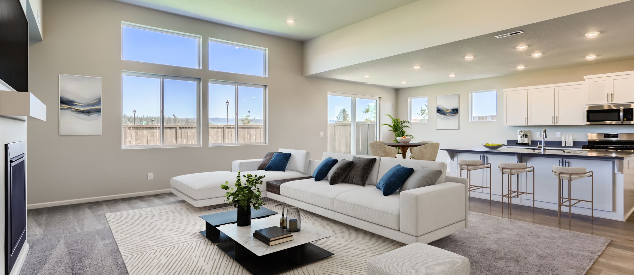The open floorplan shared between the Great Room, kitchen and dining room serves as the focal point of this single-story home, offering direct access to the patio through sliding glass doors. The owner’s suite is privately located at the back, while two secondary bedrooms are situated near the foyer.