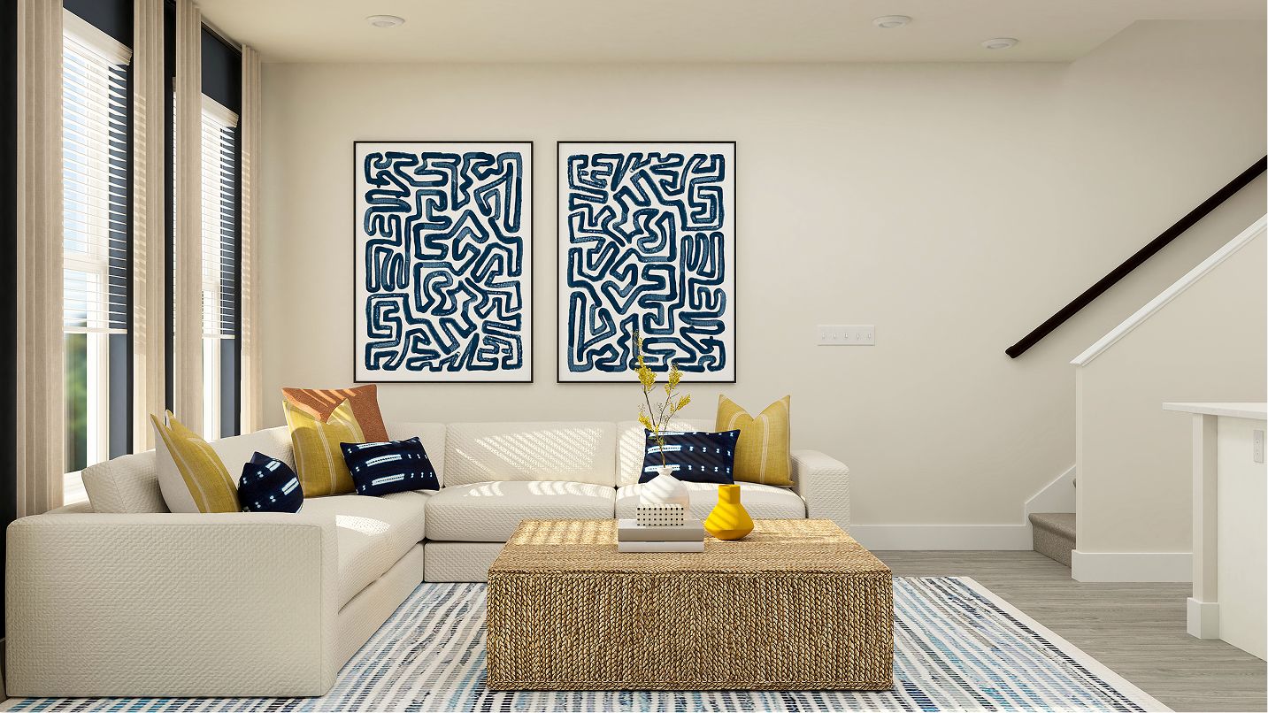 This new three-story townhome showcases a modern design. The first floor features a spacious recreation room well-suited to versatile needs, while upstairs is an open-plan layout for the main living area that includes a family room, modern kitchen and dining area with an optional deck. The top floor hosts the owner's suite as well as a secondary bedroom, both with a full-sized bathroom and large wardrobe closet.