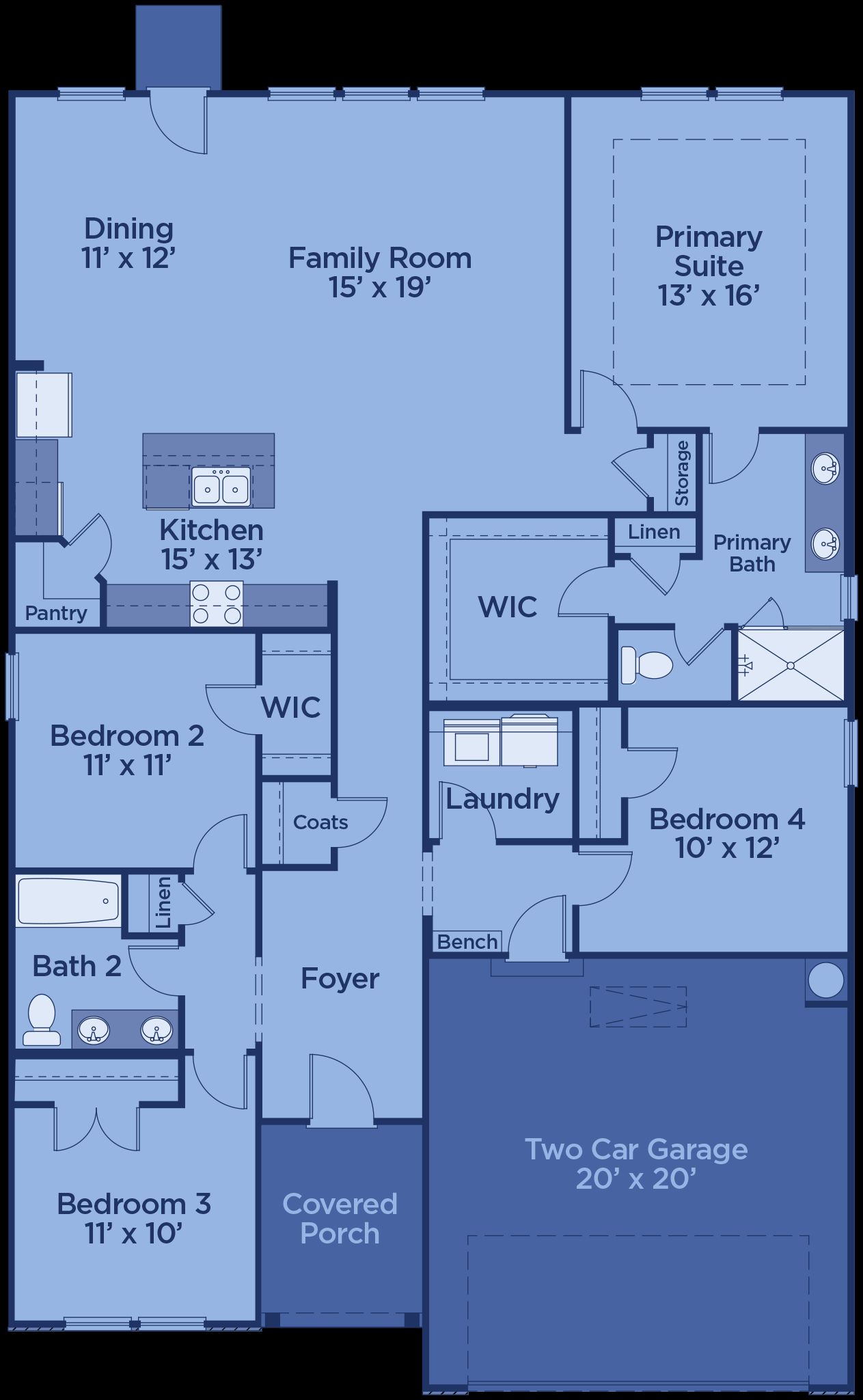 The Emerson combines elegance and functionality in a well-balanced one-story layout. A covered front porch leads into a welcoming foyer and hallway with access to two secondary bedrooms, a shared full bath, and generous closets. A third bedroom, laundry room, and mudroom are also located off the entry hall. The open-concept main living area features a modern kitchen, dining area, and family room filled with natural light. The private primary suite offers a tray ceiling, spa-inspired bath, and a large walk-in closet. An optional second floor adds a loft, third full bath, or an additional fifth bedroom.