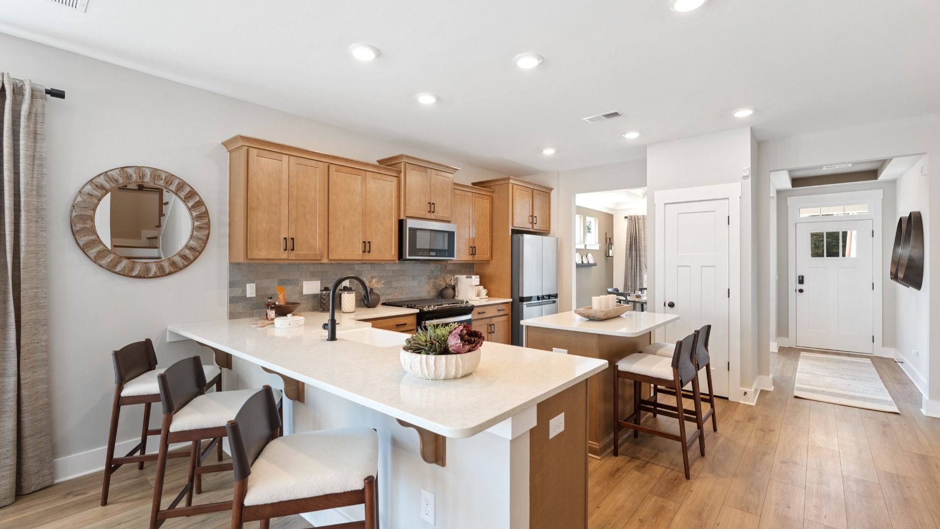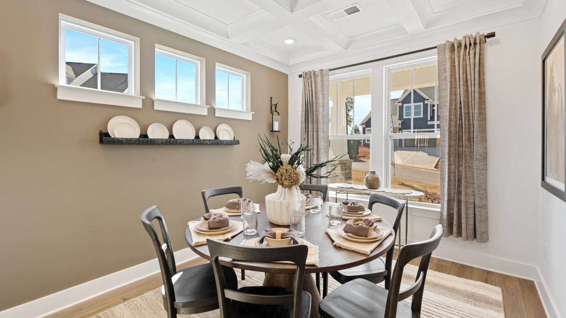 Comfort, Space, and Timeless Appeal Elevated Main Living Elegant dining room perfect for hosting Spacious kitchen with large island and bar seating open to the family room with soaring vaulted ceilings Main-Level Owner’s Retreat Generous primary suite with walk-in closet En suite bath with dual vanities and glass enclosed walk-in shower Thoughtful First-Floor Details Two coat closets for added storage and conveniently located laundry room Upstairs Living Three bedrooms, each with walk-in closets Shared full bath with dual vanities Outdoor Living Options Rear patio for everyday enjoyment with optional covered or screened porch