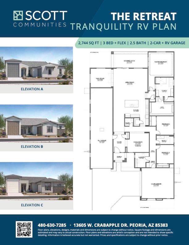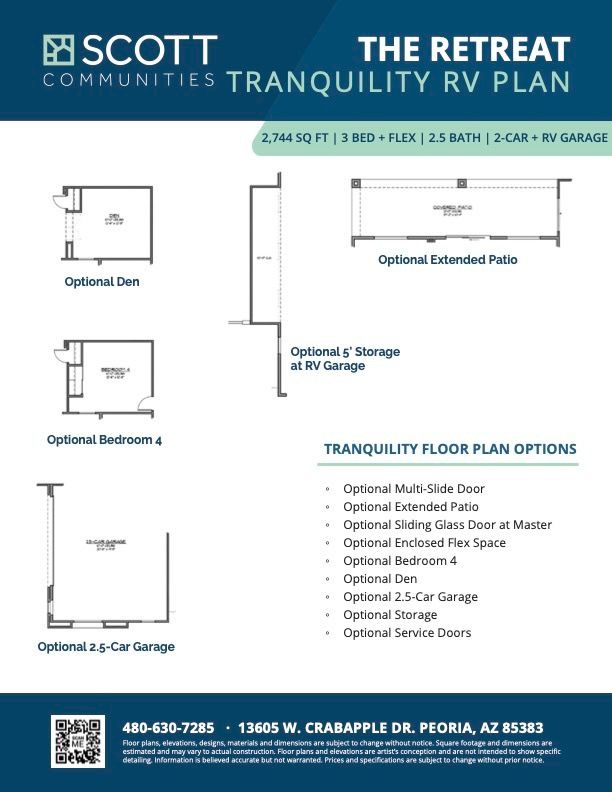 The Tranquility RV Plan at The Retreat offers 2,744 square feet of thoughtfully designed living space with 3 bedrooms, 2.5 baths, and a versatile flex room—perfect for a home office, playroom, or guest space. A highlight of this plan is the 2-car garage with RV bay, providing ample room for adventure seekers who need extra storage. The open-concept great room flows seamlessly into the gourmet kitchen and dining area, creating a warm and welcoming hub for family life. Homeowners can choose from a variety of options, including an extended patio, multi-slide doors, or even a fourth bedroom or private den, allowing you to personalize the home to fit your lifestyle. With its blend of comfort, flexibility, and functionality, the Tranquility RV Plan is designed for modern Arizona living.
