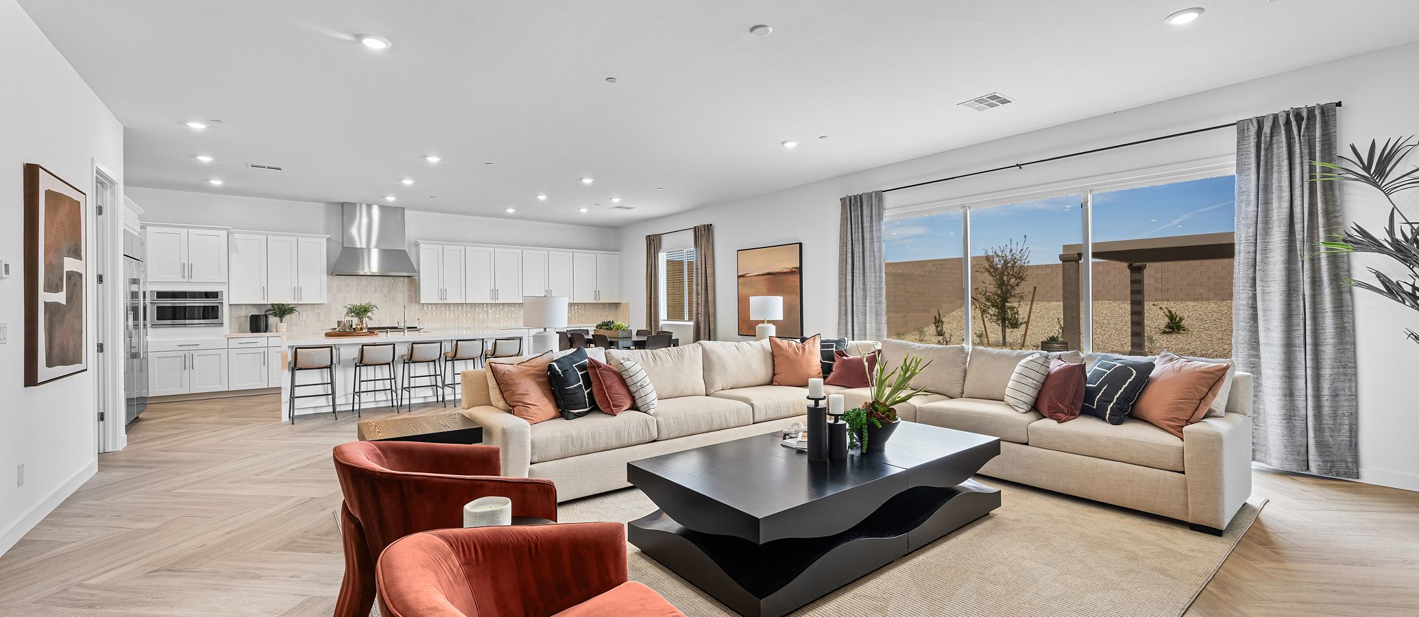 This brand-new single-story home features the innovative Next Gen® suite, showcasing a separate entrance, living room, two bedrooms, bathroom, kitchenette and laundry room to accommodate multigenerational living. The main living area is host to an open-concept layout with the kitchen, dining room and Great Room. At the center of four bedrooms, a versatile flex space adds an additional living area. The expansive owner’s suite enjoys a private corner for optimal comfort. An RV-height garage completes the home.