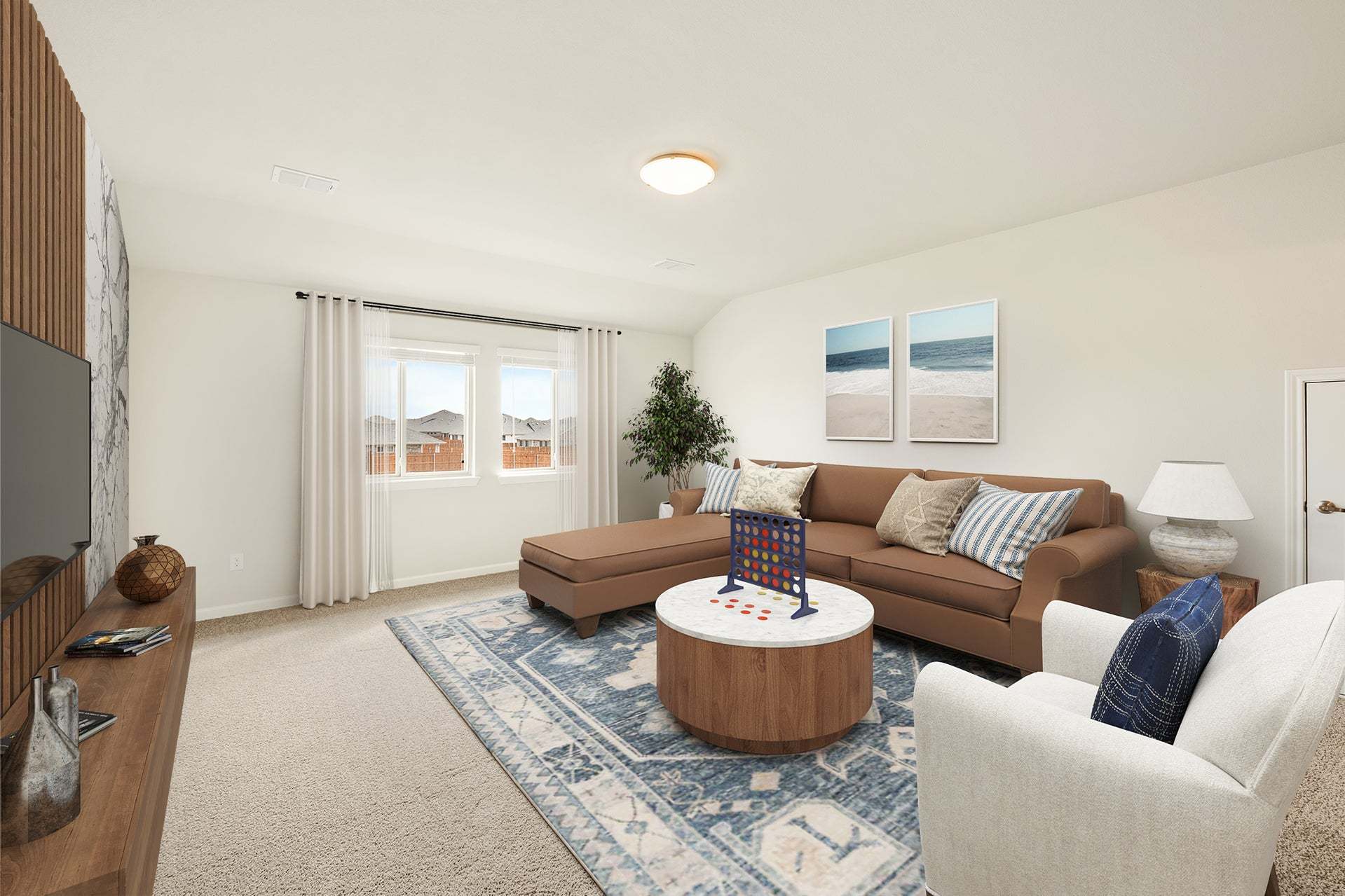 The Elements Series Gardenia floor plan is a two-story home with four bedrooms and two and a half bathrooms. Features of this plan include a large family room, an open dining and kitchen with custom cabinets and an island, a primary suite with a walk-in closet, and an upstairs game room. Contact us or visit our model home for more information about building this plan.