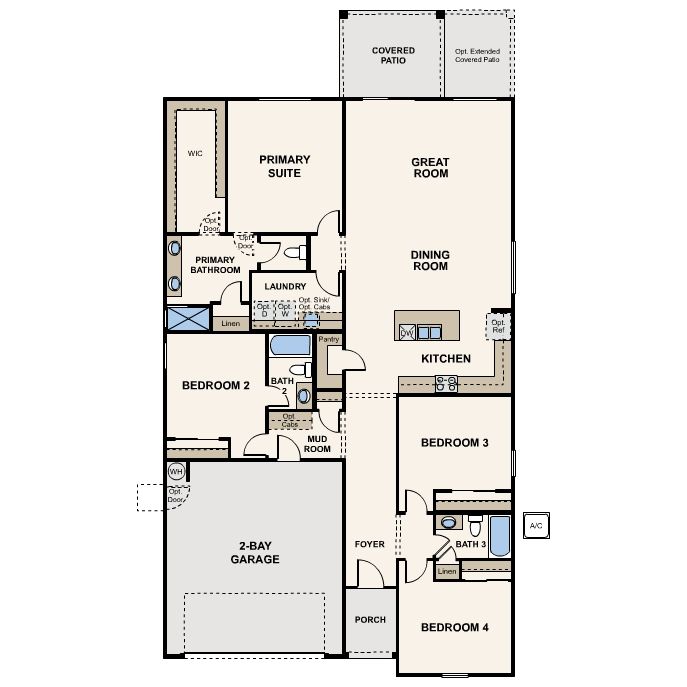 Ranch | 2 Bay Garage with Entry | Mud room | Foyer | Kitchen with Island, Pantry and Dining Room | Great Room with Yard Access | Primary Suite with Bathroom and Large Walk-In Closet | Bedroom 2 with En-Suite Bath | Bedrooms Three and Four Share Full Bath | Laundry Room | Covered Patio Options: Primary Bath Tub and Shower | Primary Bath Shower | 8 ft doors Impressive Included Features: 9’ ceilings throughout, covered patio, front yard landscaping, ceramic tile flooring at entry, kitchen, all baths and laundry, granite slab counters in kitchen and baths, stainless steel kitchen appliances, Century Home Connect smart home technology.
