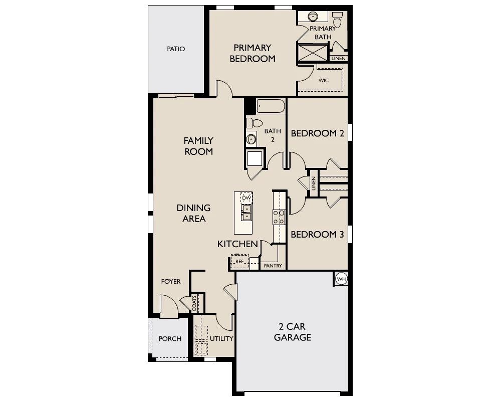 From the covered porch, you step into the foyer, where you're greeted by a coat closet and welcomed into the open dining area, kitchen, and family room. Just off the kitchen is the laundry room, which also provides access to the two-car garage. The family room leads to a back patio for outdoor living, as well as the private primary bedroom featuring a walk-in closet and a spacious primary bath. Also located off the kitchen are two additional bedrooms that share a full bath and have access to a nearby linen closet.