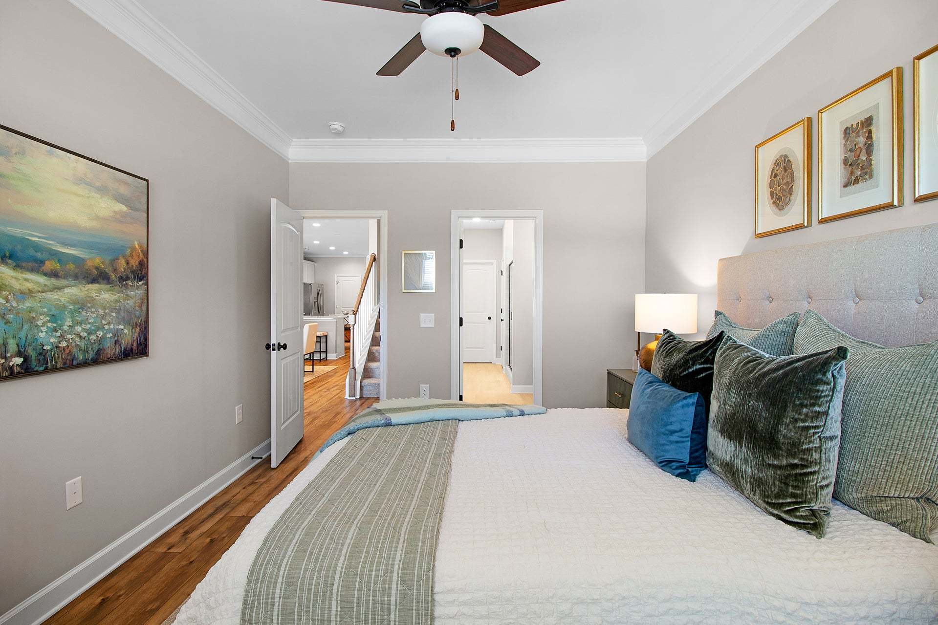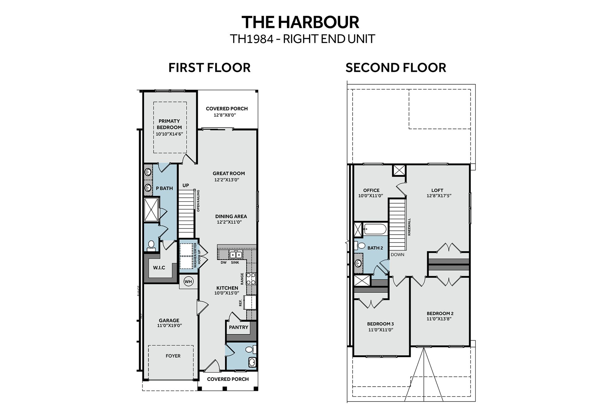 This open-concept townhome plan features plenty of both living and bedroom space in its 1,984 square feet! Upon entering the home, you are greeted with a foyer and powder room. The kitchen, open to the dining area and great room, features a spacious island with seating, plenty of countertop/cabinet space, and a walk-in corner pantry. A laundry closet with washer/dryer hookups is located off of the kitchen. The open dining area and great room have access to the rear covered porch. The primary suite, conveniently located on the first floor, includes plenty of natural light and a tray ceiling option. The en suite bathroom features a double vanity, walk-in shower, private water closet, and walk-in closet. Atop the stairs is a loft space with a closet with access to a home office. The second fl...