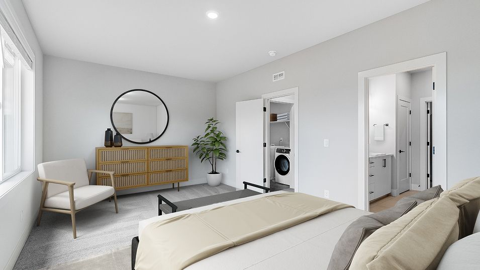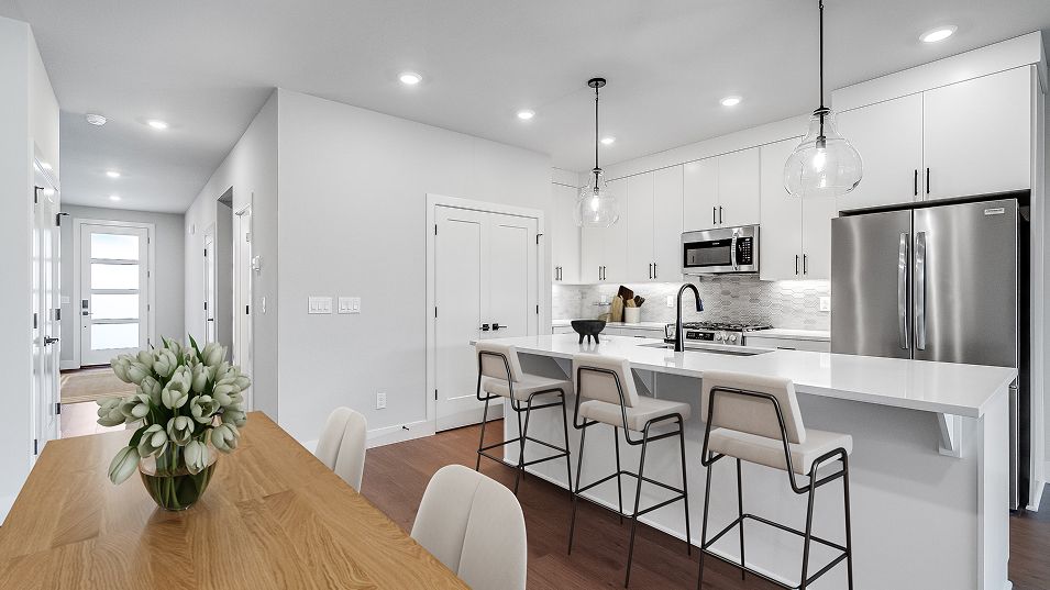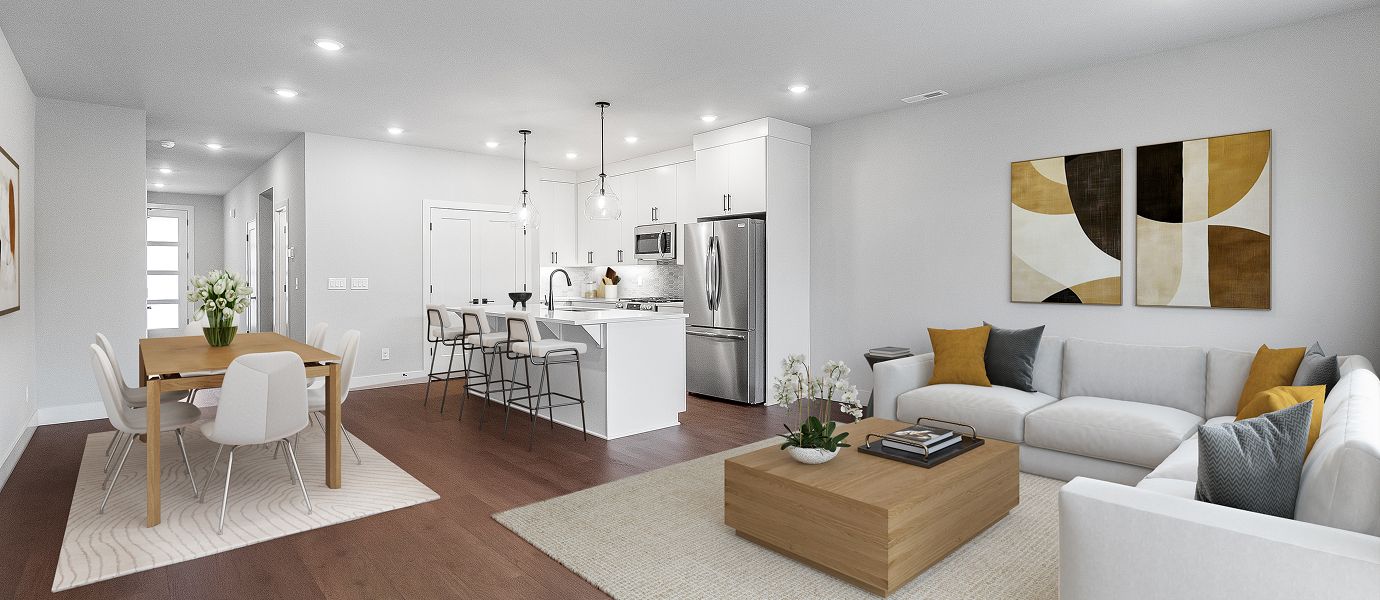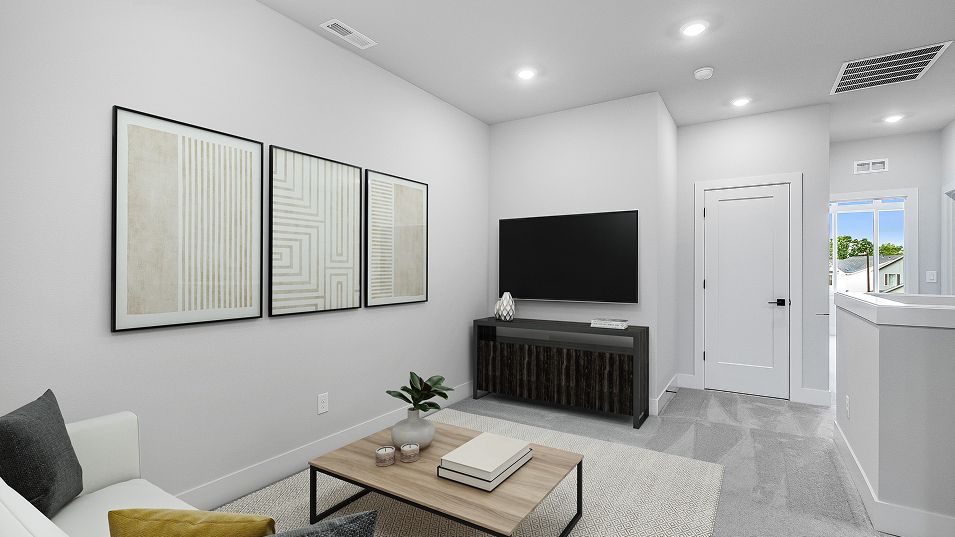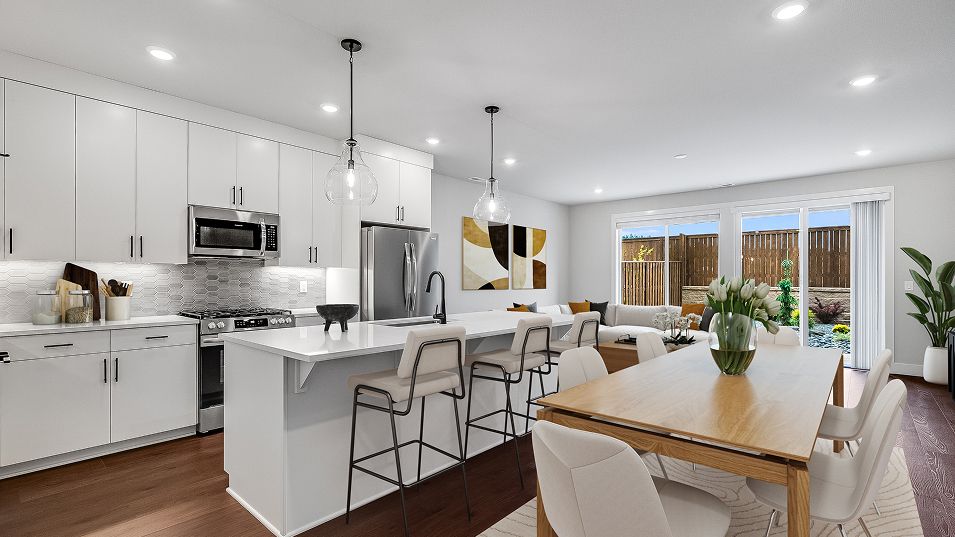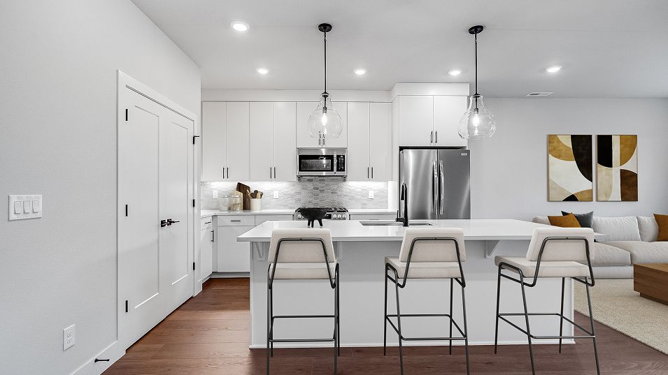 The first floor of this new two-story townhome features a spacious and flexible open-concept layout shared between the kitchen, living and dining areas. A nearby covered patio provides convenient outdoor entertainment and leisure. A versatile loft offers a shared living area on the second floor near three bedrooms, including the lavish owner’s suite complete with a spa-inspired bathroom and walk-in closet.