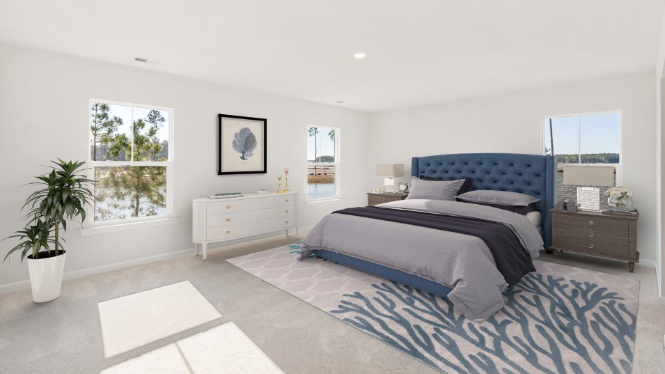 This two-story home is the second largest plan in the collection and features a spacious flex space and upstairs bonus room with endless possibilities. On the first floor is a practical study, a family room with a charming fireplace, an open-concept kitchen and breakfast room, along with a large outdoor patio. Throughout the home is a total of four comfortable bedrooms, including the expansive owner’s suite with a serene bathroom.