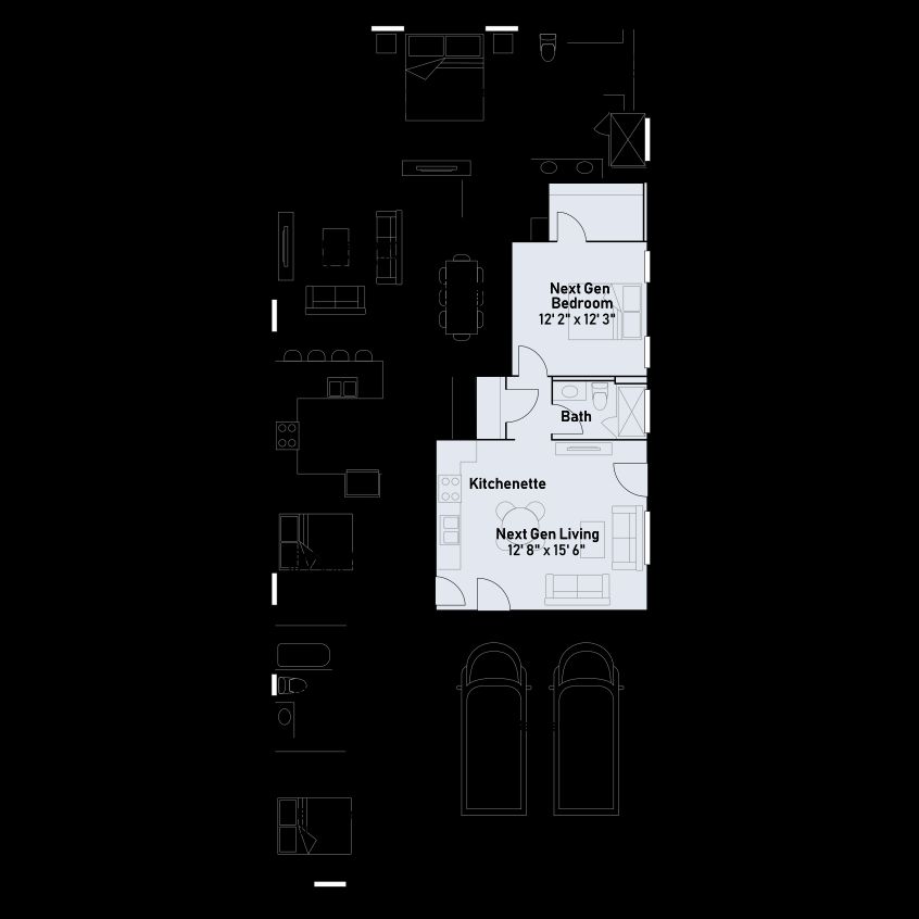This single-level home showcases Lennar’s signature Next Gen® suite, which is comprised of a separate living space, kitchenette, bedroom and bathroom, ideal for multigenerational living. In the main home, the Great Room, kitchen and dining room are arranged among a convenient open floorplan, with sliding glass doors that lead to the covered patio. The owner’s suite is situated at the back of the home, while two bedrooms are found off the foyer.