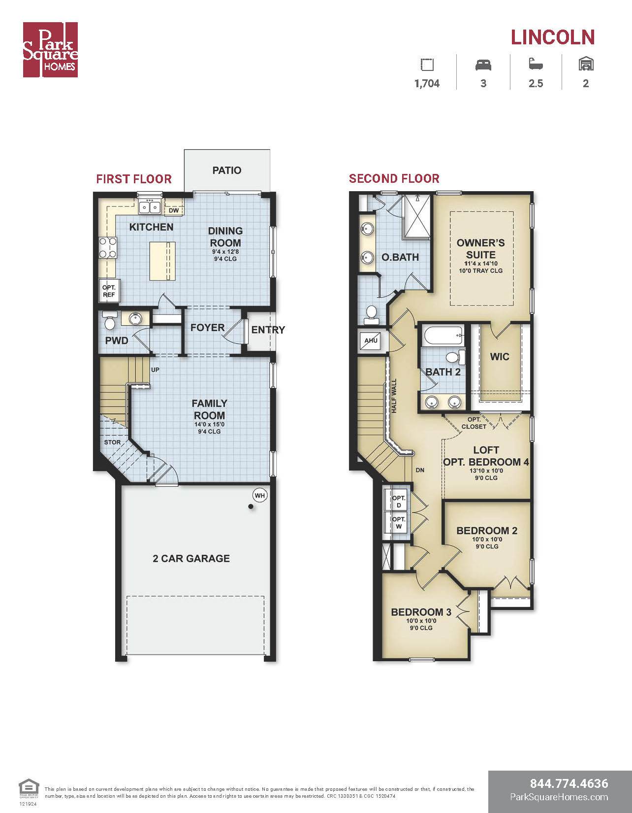 The Lincoln tiled first floor includes a family room and powder room, kitchen and dining room. The kitchen includes quartz countertops and stainless steel appliances. The Master Suite is located on the second floor boasting a grand master bath with double sinks and spacious walk-in closet. Surrounding the loft area is 2 additional bedrooms with full bathroom.