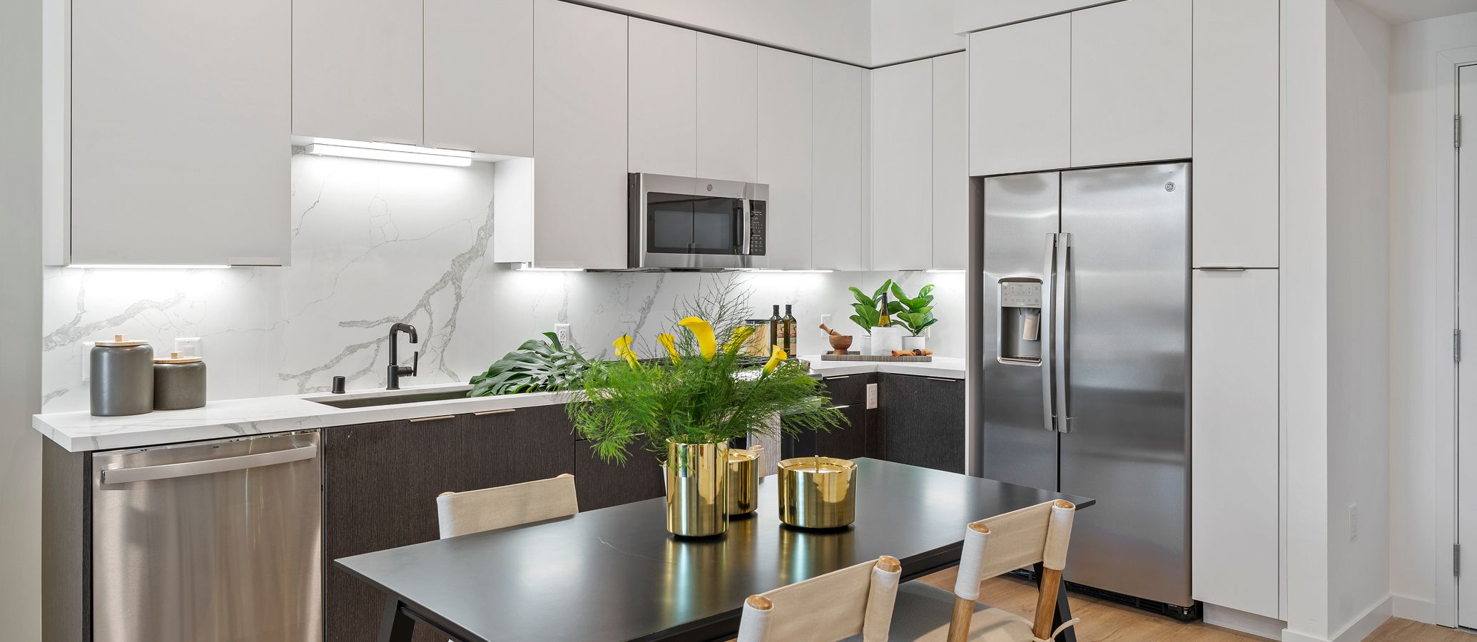 This single-level condo features a modern design. An open-concept floorplan maximizes interior space, and the luxurious owner’s suite is tucked away to the side of the home for enhanced comfort and privacy, offering access to a full-sized bathroom and walk-in closet.