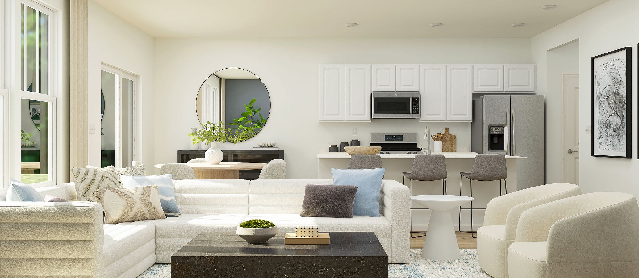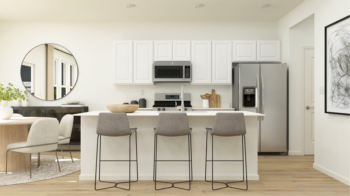 This new two-story townhome design combines comfort and elegance. On the first floor, the Great Room, which is the heart of this home, extends effortlessly to the dining room and kitchen in an open-plan layout. The patio enhances outdoor enjoyment. On the second floor, two secondary bedrooms and a spacious owner’s suite provide restful retreats for family members or overnight guests.