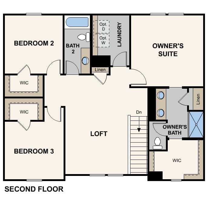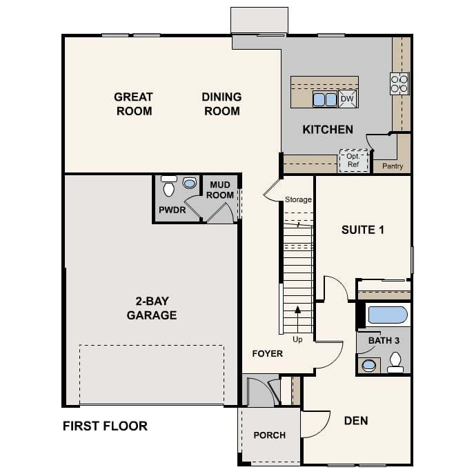 The Marion is a well-appointed two-story design spanning 2,454 square feet. The main level boasts an open-concept great room, dining area, and kitchen with a corner walk-in pantry. For added convenience, the first floor features a mud room, and powder room. It also has a suite with a den and private entrance off the front porch, perfect for multi-generational living. Upstairs, a spacious loft connects the laundry room and additional bedrooms, including the spacious owner’s suite with a private en-suite bathroom and walk-in closet. Each bedroom is thoughtfully designed with its own walk-in closet, ensuring ample storage and personal space.