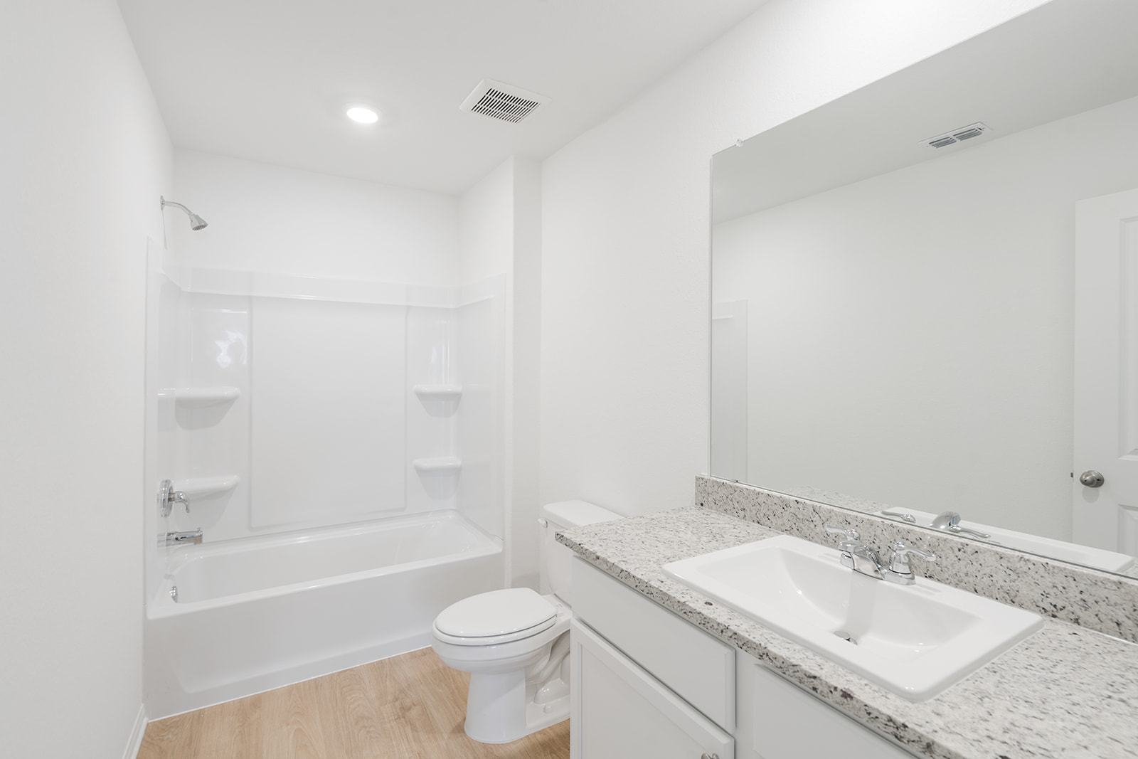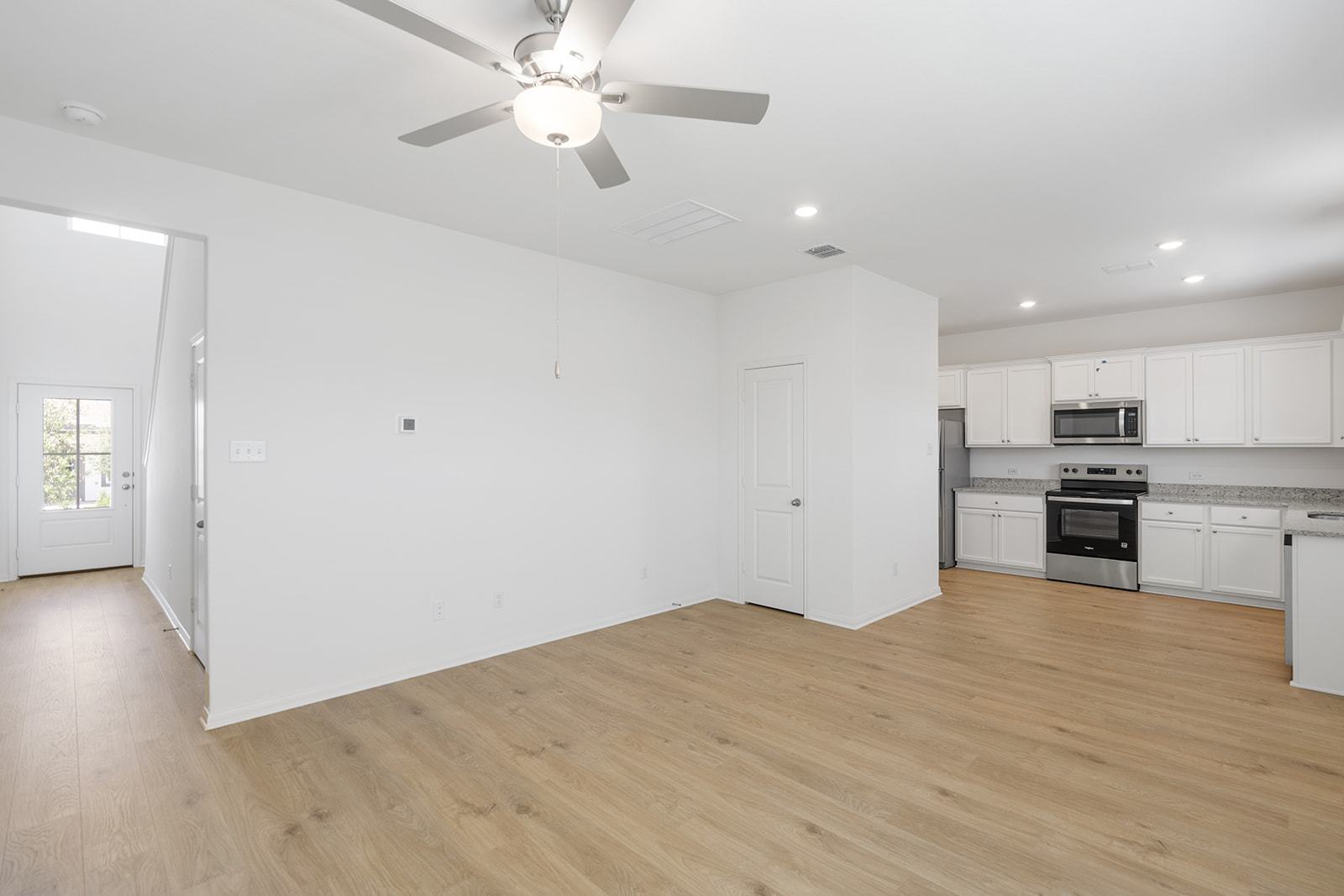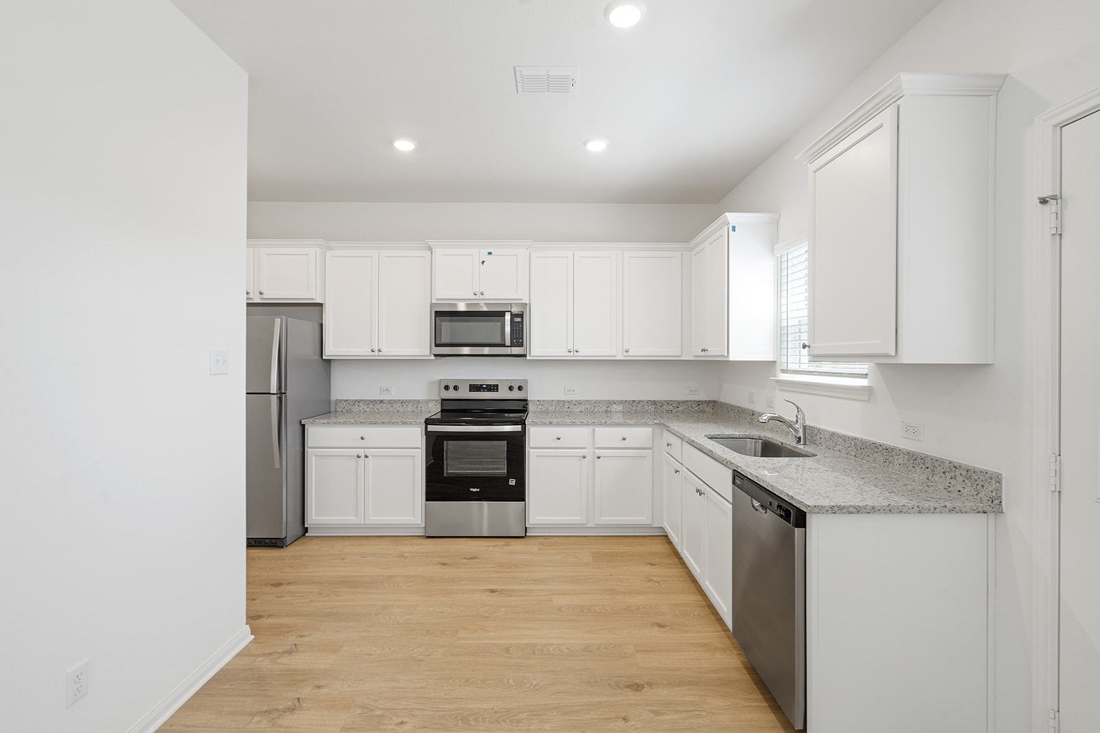 The three-bedroom Marley plan features a functional, open layout designed for easy entertainment. The chef-inspired kitchen showcases granite countertops, stainless steel appliances, and modern white cabinetry. In addition, programmable thermostats, designer coach lighting, double-pane Low-E vinyl windows and a WiFi-enabled garage door opener give the home features and finishes today’s homebuyers are looking for.