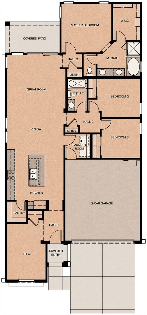 The McFadden at 1668 is the largest single level home in the Redwood Valley series. It has 3 bedrooms, 2 baths, flex room and a two car garage, It can be expanded to a 4th bedroom or home office. The HERS rating is an amazing 38.