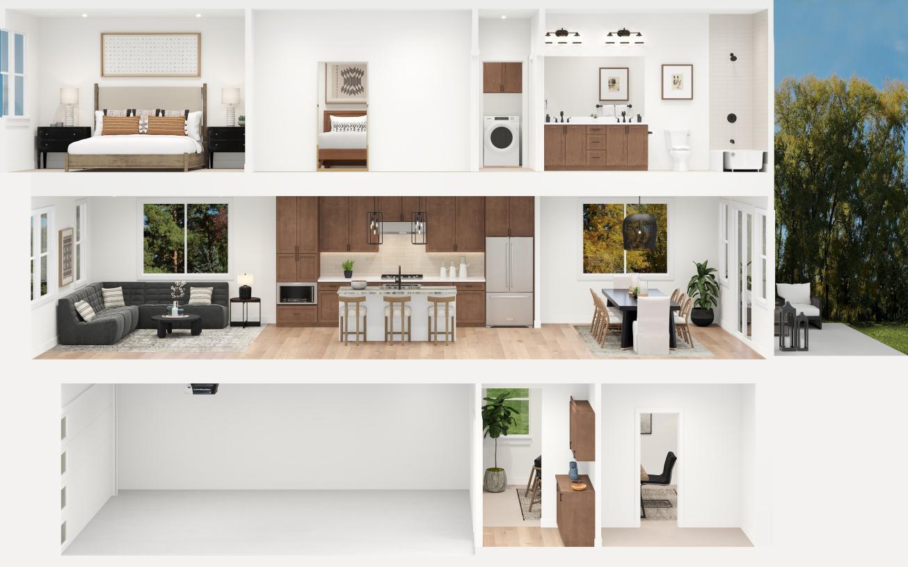 The McNary offers an open floor plan for modern living. An inviting foyer opens to a versatile flex room and stairs leading to the main living area. The elegant great room is bathed in window light and complete with a relaxing fireplace. Adjacent to a bright casual dining area, the well-equipped kitchen features an island with breakfast bar, ample counter and cabinet space, and a walk-in pantry. Tucked away on the third floor, the primary bedroom is a true retreat with a roomy walk-in closet and a serene bath featuring a dual-sink vanity, a luxe shower, and a private water closet. Two secondary bedrooms have access to a full hall bath with dual-sink vanity. Additional highlights include an everyday entry, a second-floor powder room, convenient bedroom-level laundry, and plentiful storage.