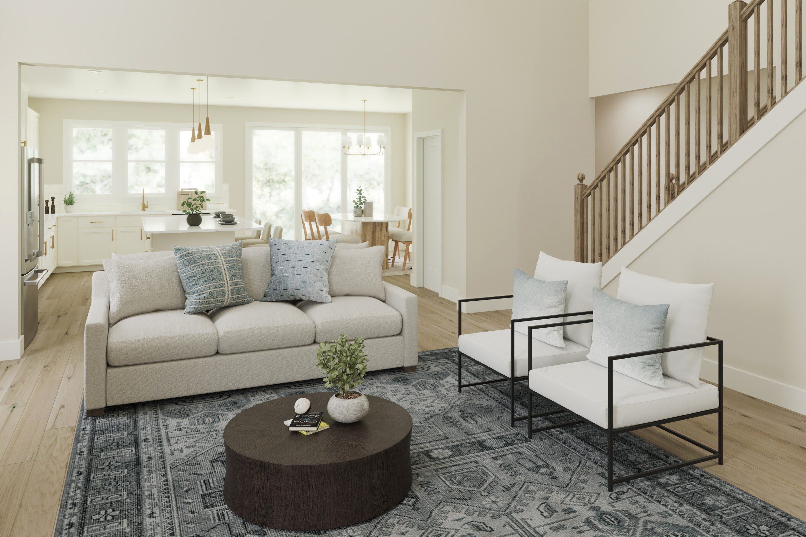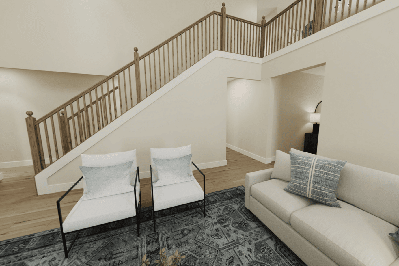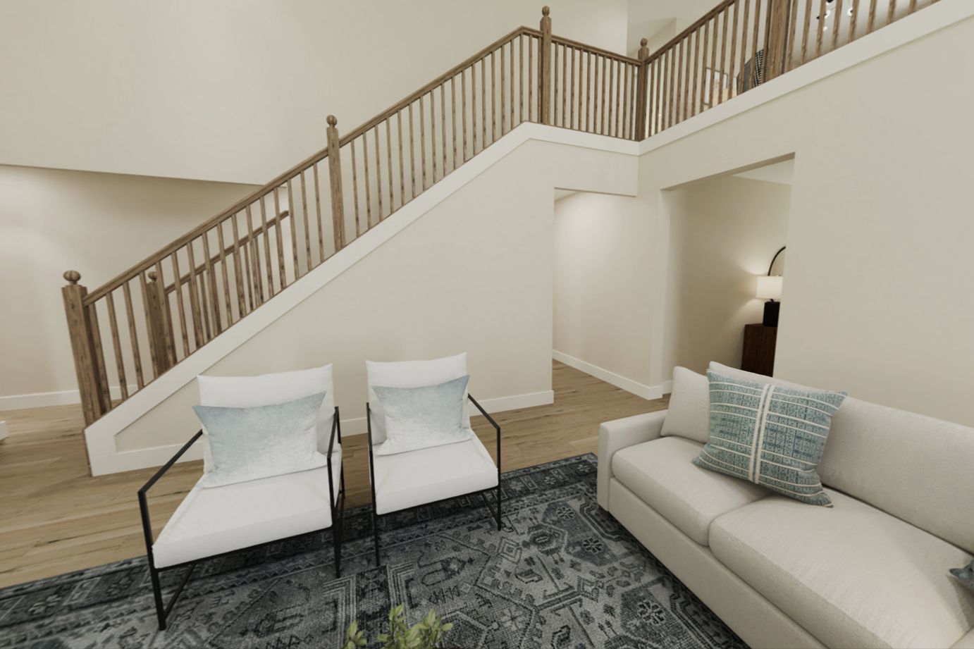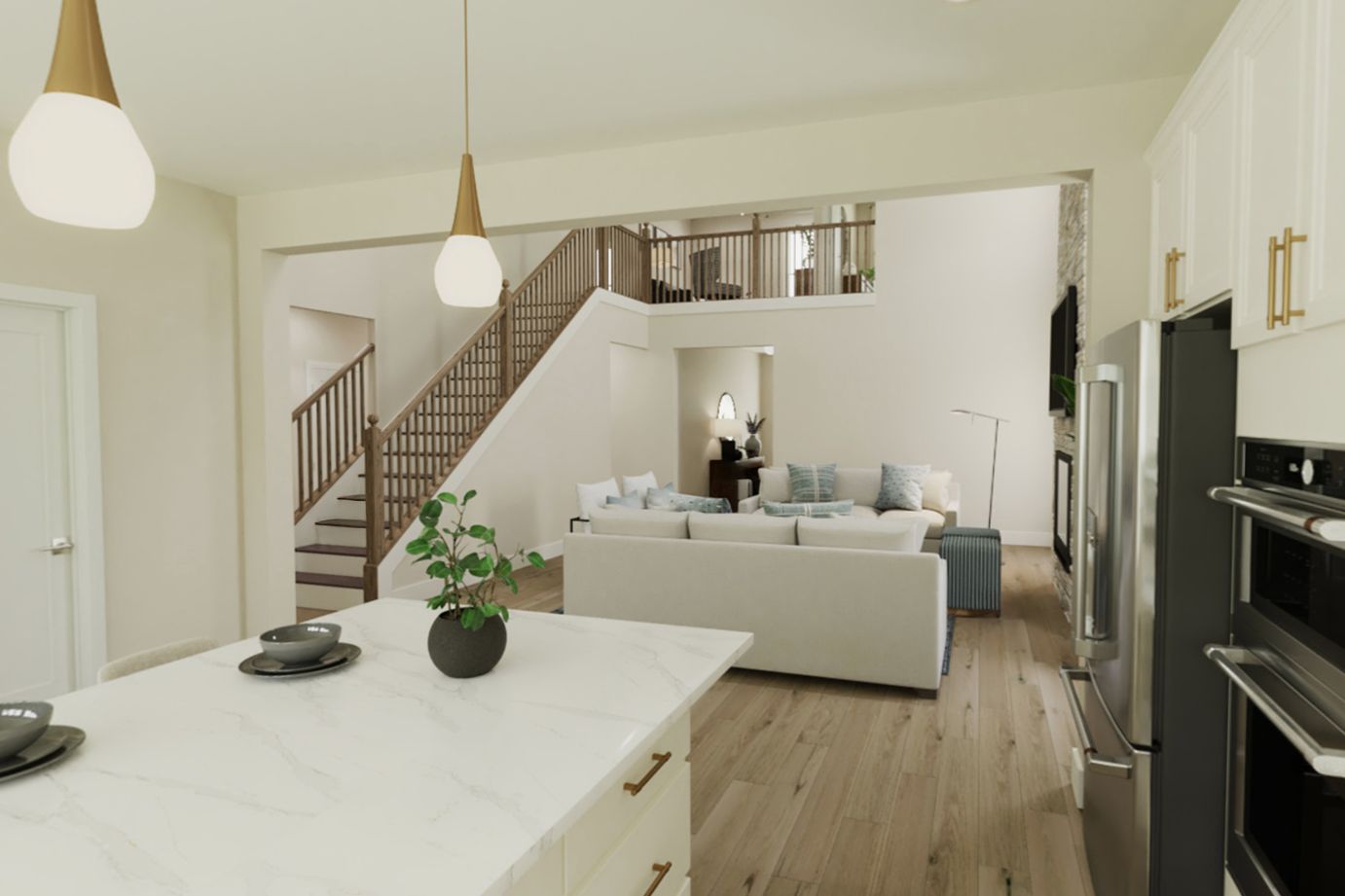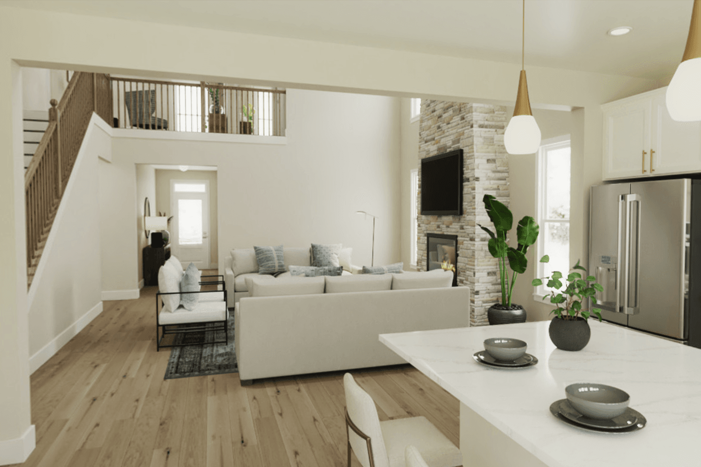 The Olive plan features a soaring two-story Family Room at its center, with the Kitchen at the rear for easy indoor-outdoor living. The spacious Owners Suite offers privacy and direct access to the Family Foyer, with an expansive bath and optional laundry room access. Upstairs, two bedrooms and a loft, which can be a fourth bedroom, overlook the Family Room. The entry Living Room can be converted into a study or guest suite with a full bath. A generous optional covered patio/deck enhances the living space.