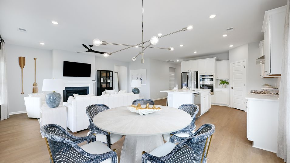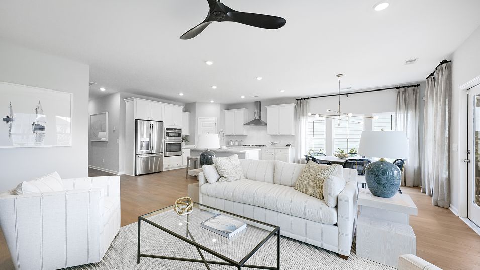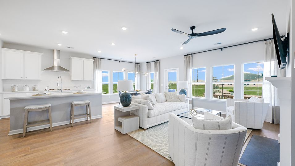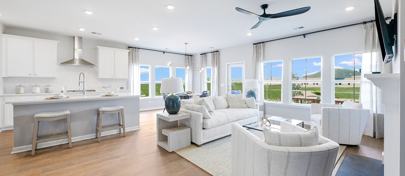 Set within Horizons, our 55+ active adult community, this new home offers the comfort and convenience of single-story living combined with an expansive design. Two secondary bedrooms share a hall bathroom at the front of the home, while the owner’s suite with a luxe bathroom and walk-in closet is situated in a back corner. A modern open-plan layout flows effortlessly among the kitchen, family room and dining room, leading out to a screened porch for outdoor moments.