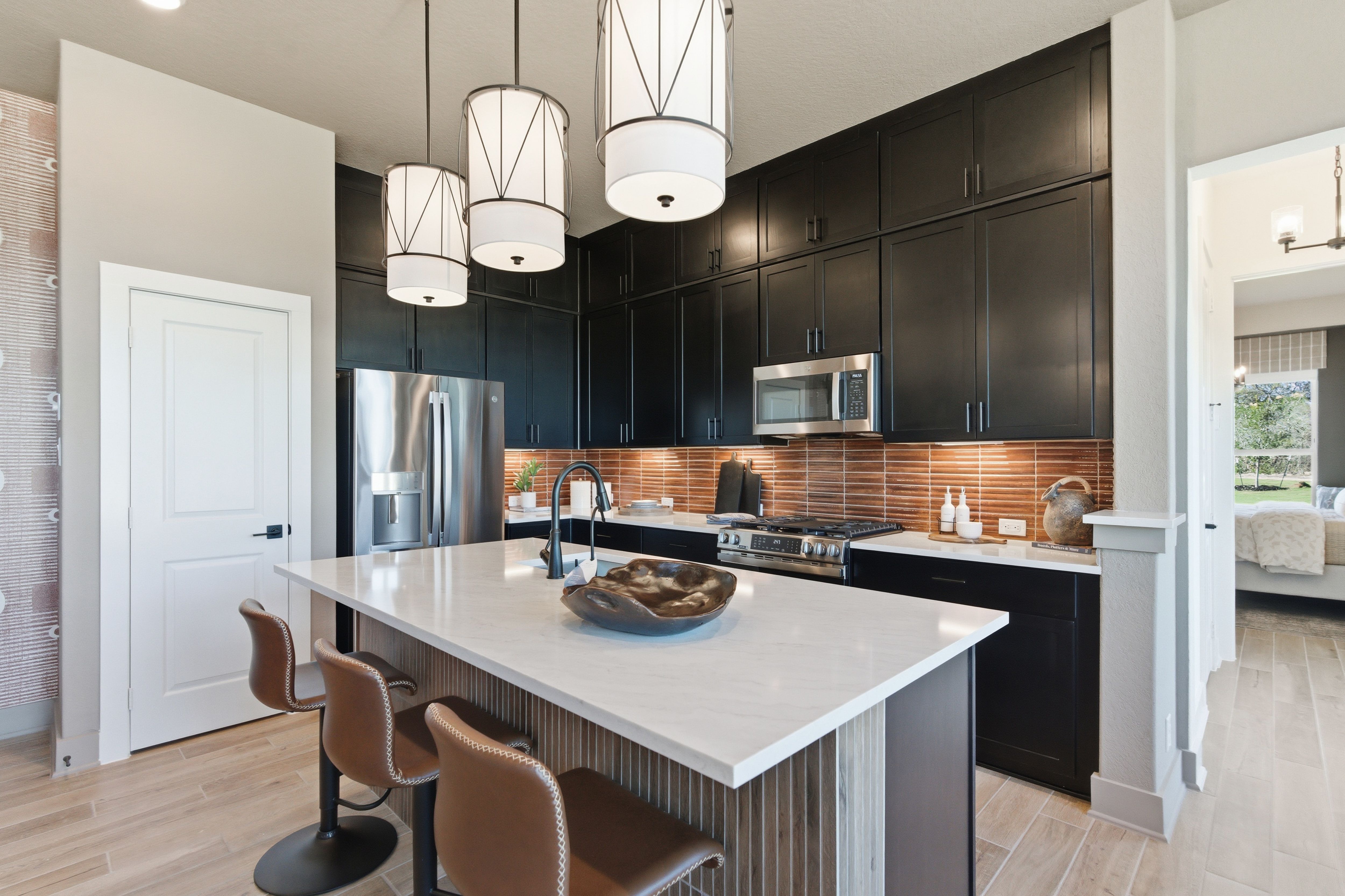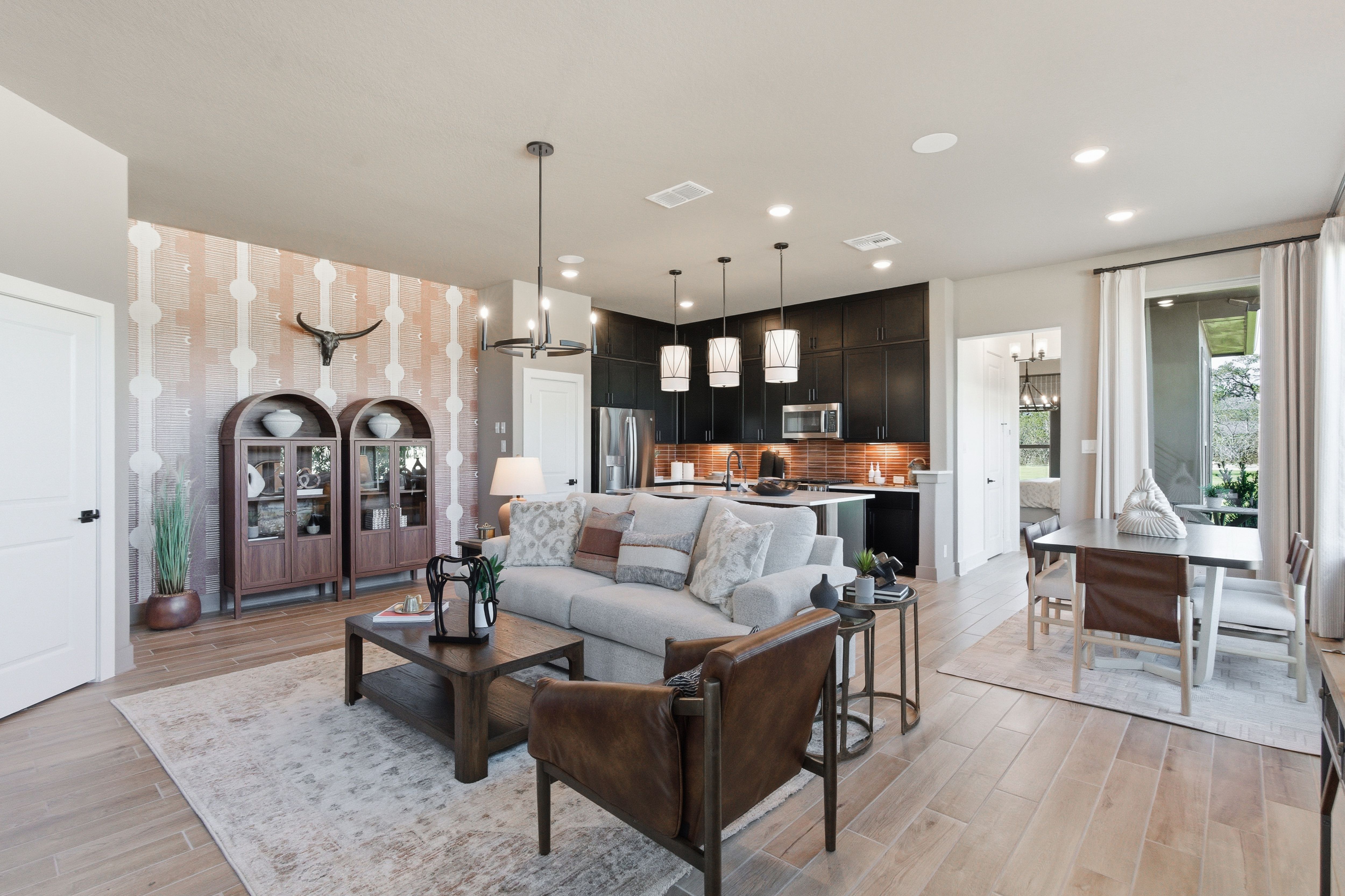 Two-story home featuring 3 bedrooms, 2.5 baths, game room, tech center, 2-car garage, and more! The open concept kitchen boasts a large kitchen island overlooking a breakfast area and a family room with a full wall of windows. The primary retreat includes a back window bump out, walk-in shower, walk-in closet, and convenient access to the outdoor covered patio. Upstairs you'll find a game room, a tech center, plus two secondary bedrooms both with walk-in closets and a shared full bath.