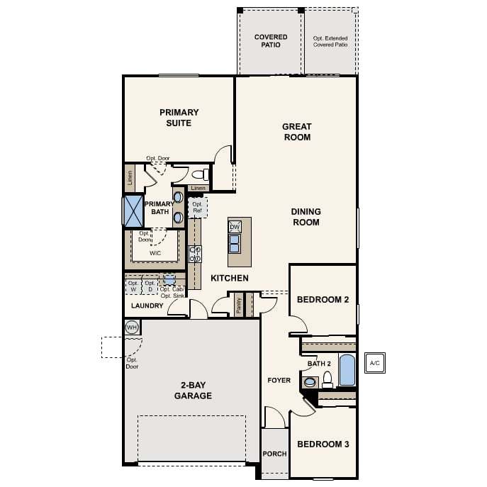 Ranch | 2 Bay Garage with Entry | Foyer | Laundry Room | Open Kitchen with Island and Pantry | Dining Room | Great Room with Yard Access | Primary Suite with Bath and Large Walk-In Closet | Secondary Bedrooms with Shared Full Bath | Covered Patio Options: Primary Bath Tub and Shower, Primary Bath Super Shower, 3 Bay Garage, Laundry Sink and Cabinets, Garage Service Door Impressive Included Features: 9’ ceilings throughout, covered patio, front yard landscaping, ceramic tile flooring at entry, kitchen, all baths and laundry, granite slab counters in kitchen and baths, stainless steel kitchen appliances, Century Home Connect smart home technology.