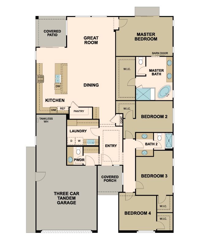 This functional floor plan offers four bedrooms and desirable open-concept living space on a single level. Enter Plan 2296 from the covered front porch or three-car garage into an entryway featuring a half bathroom, coat closet and laundry room with built-in cabinetry. Also near the entry is a hallway leading to three bedrooms with their own walk-in closets and a shared full bathroom. Next, the home opens up to the combined dining area, kitchen and great room. Sought-after features include a large island equipped for seating, a walk-in pantry and access to a private back patio. Off the great room you’ll find the master suite, complete with a spa-inspired soaking tub, separate shower, dual-sink vanity and walk-in closet.