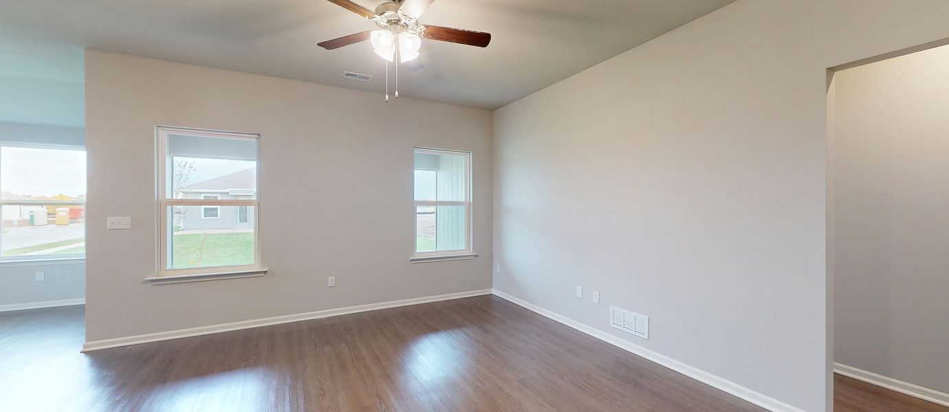 This new single-story home offers ample space to live and grow with two bedrooms and a luxurious owner’s suite at the back of the home, complete with a full bathroom and walk-in closet. An open-concept main living area includes a multifunctional kitchen, a spacious family room and a dining room, which enjoys direct access to a covered patio for simple indoor-outdoor living. A two-car garage completes the home.