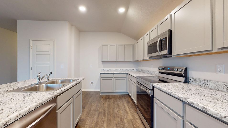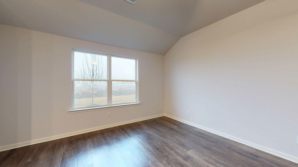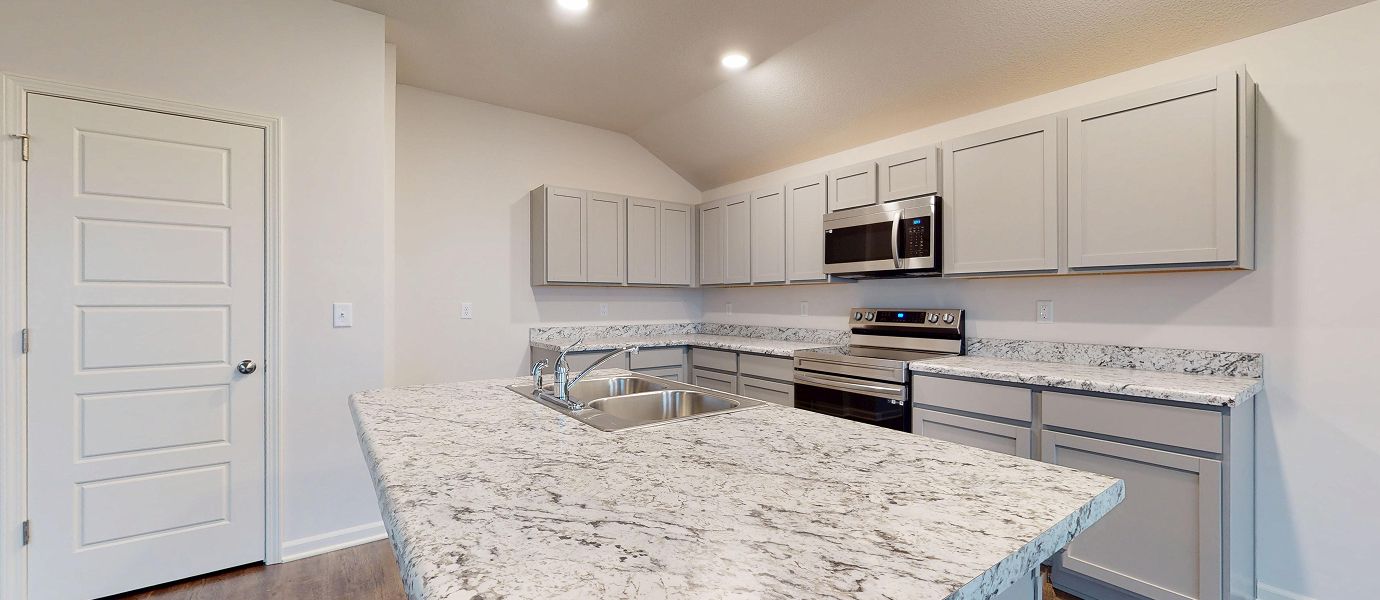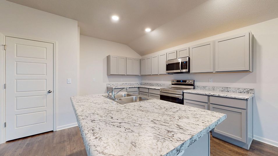 This new single-story home features three bedrooms near the front off the entry. An open-concept floorplan combining the kitchen, living and dining areas makes it easy to entertain and relax throughout the week. Nestled into a private rear corner is the luxurious owner’s suite, complete with a full bathroom and walk-in closet.
