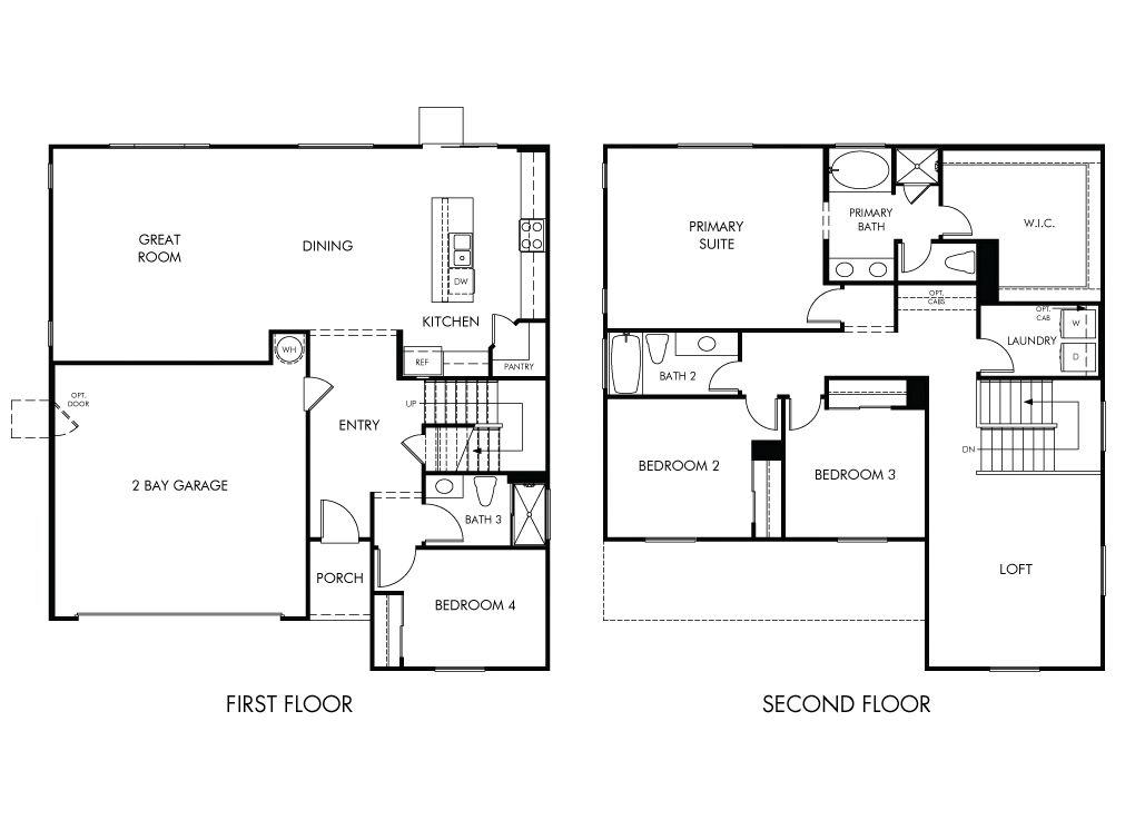 This floorplan features 4 bedrooms, 3 full bathrooms and a 2-bay garage. The upstairs loft is perfect for a home office or media room, while the first-floor bedroom and full bath is ideal for live-in or visiting guests.