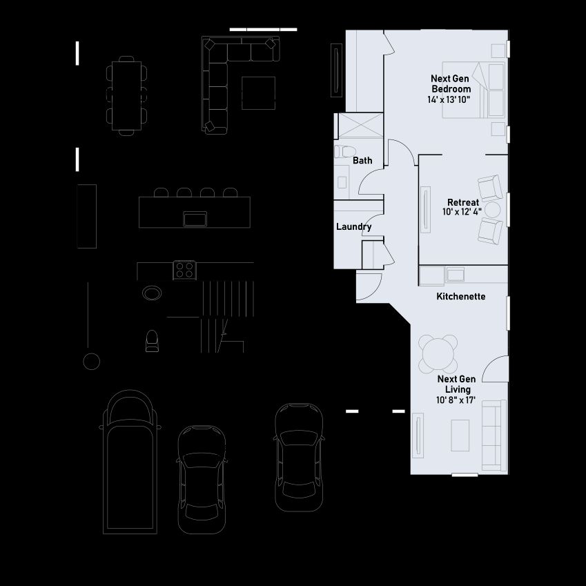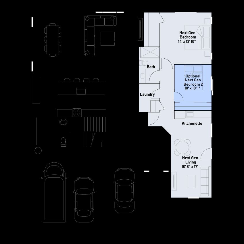 This new two-story Next Gen® home features a private suite with a separate entrance, living area, kitchenette, bedroom and bathroom ideal for multigenerational households. The main home is host to an inviting open-concept layout where the kitchen, living and dining areas meet. On the second level, four additional bedrooms, including the lavish owner’s suite with a full bathroom and retreat, surround a versatile loft.