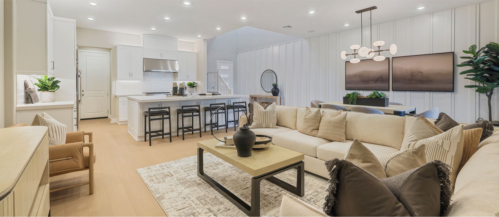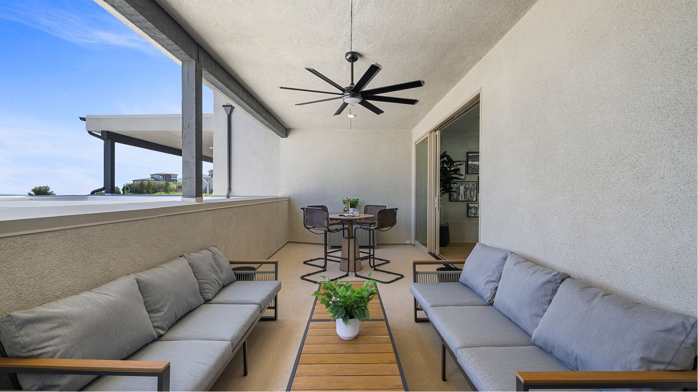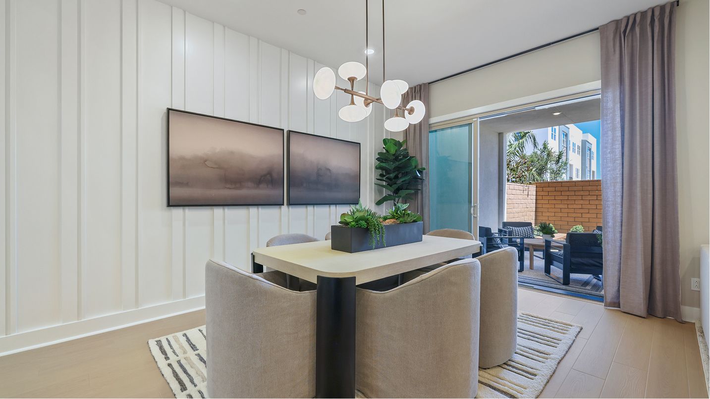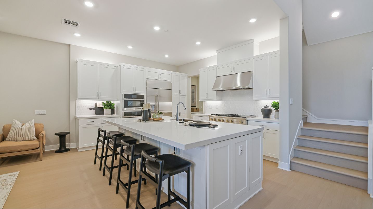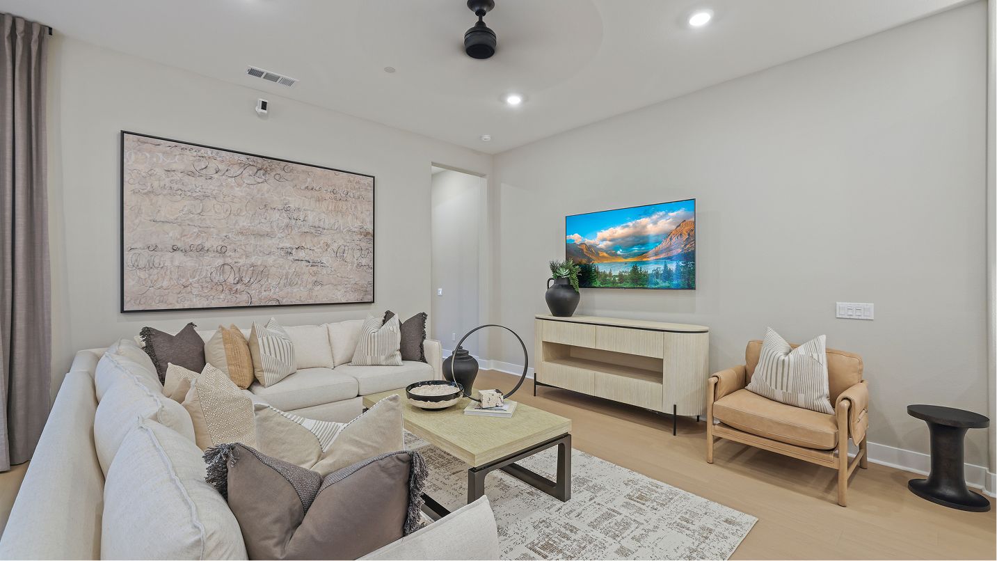 This three-story townhome is host to an open floorplan shared between the kitchen, living and dining rooms, with direct access to an outdoor room through sliding glass doors. A secondary bedroom at the back is ideal for overnight guests or a home office. A loft and three bedrooms occupy the second floor, while the top level has a spacious bonus room and outdoor terrace.