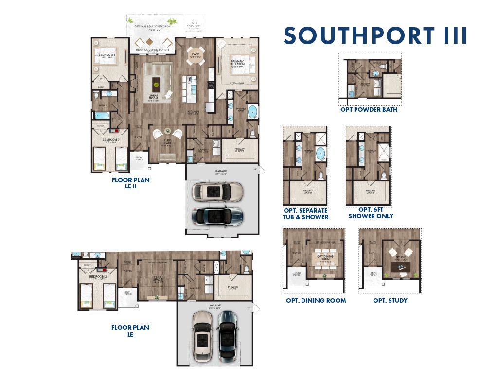 Walking into the Southport III, you’ll be impressed by the open family room attached to the kitchen and bright café area. The primary suite comes complete with a roomy walk-in closet and a double sink vanity This plan also includes an optional upgrade for a formal dining room or study inside of the flex space. You will appreciate the rear covered porch, laundry options and spacious garage.