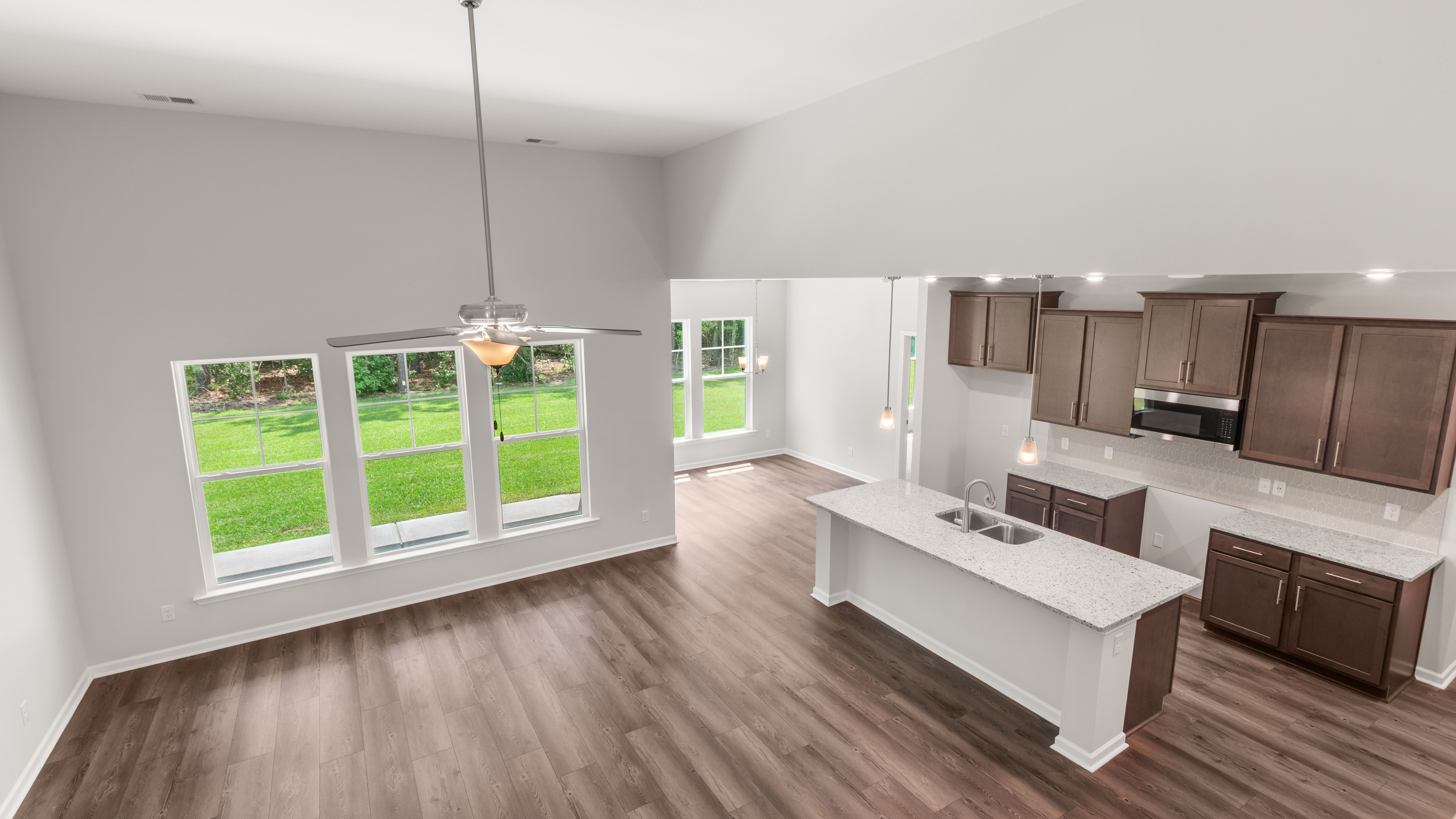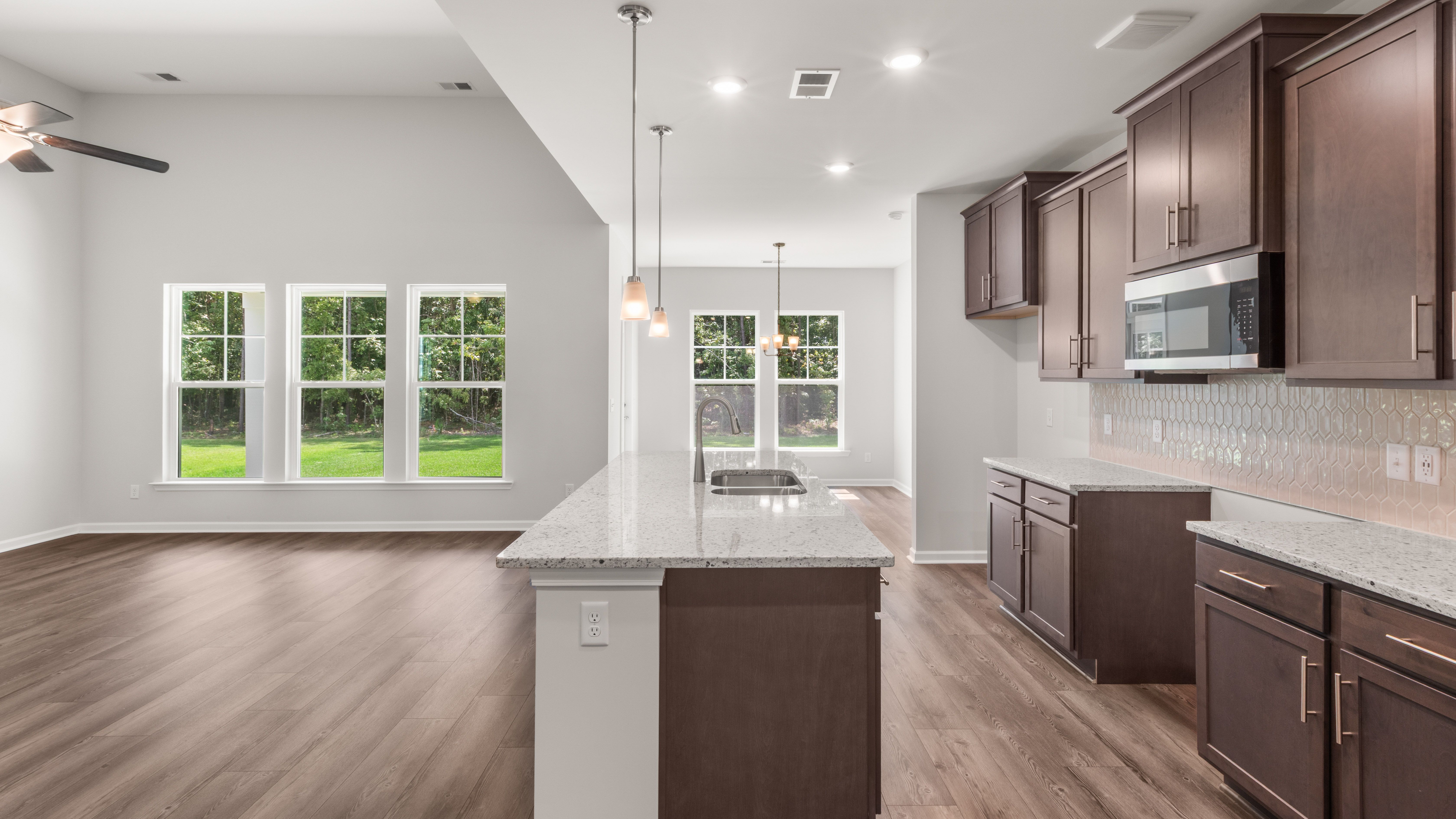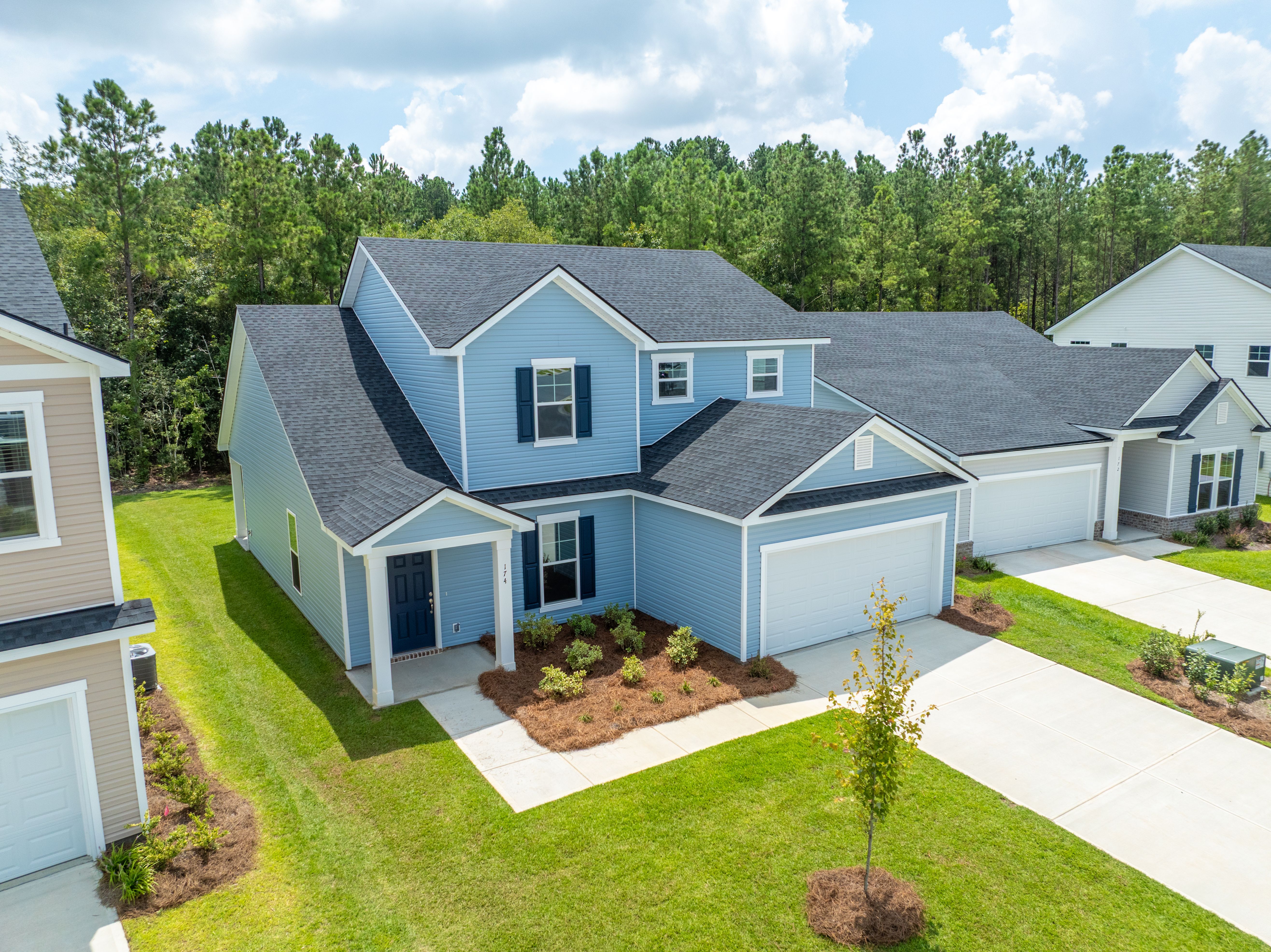 In the Stillwater, the primary suite is on the main floor, with a flex room that includes an option to be a den or study room. The second floor provides three bedrooms three additional bedrooms with a full bath. More features include a rear porch, two-car garage, and a spacious kitchen, dining, and living room concept.