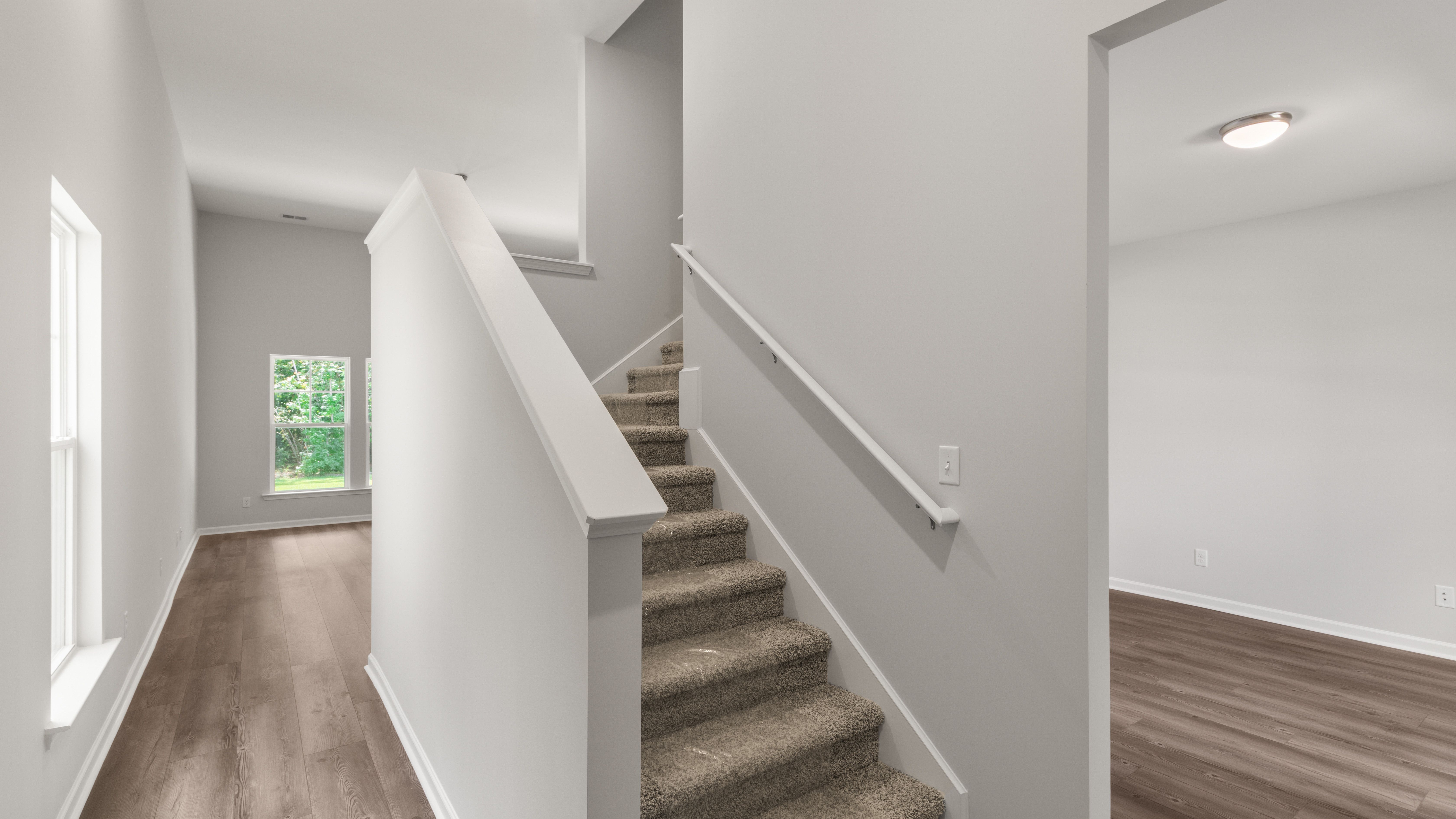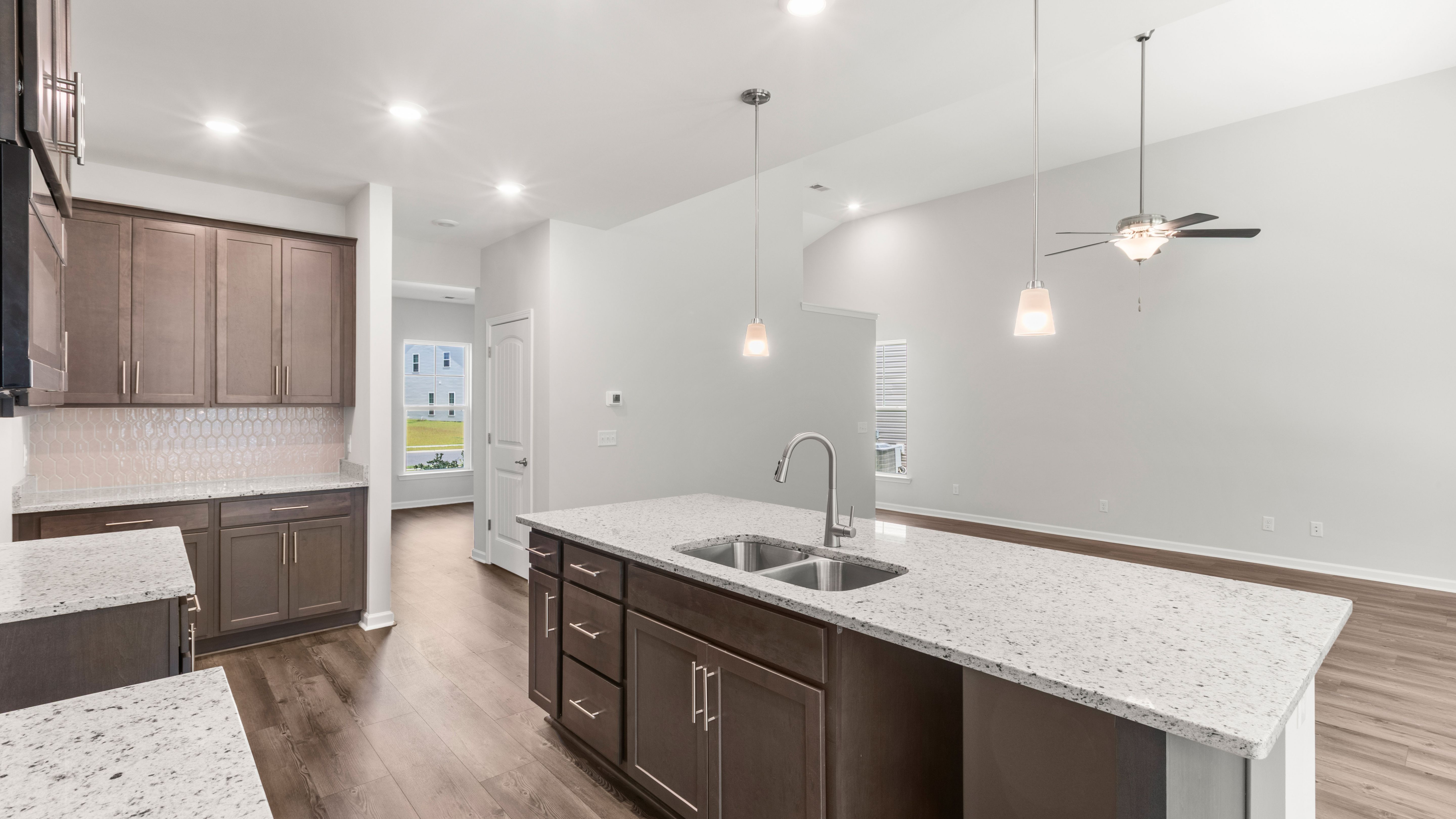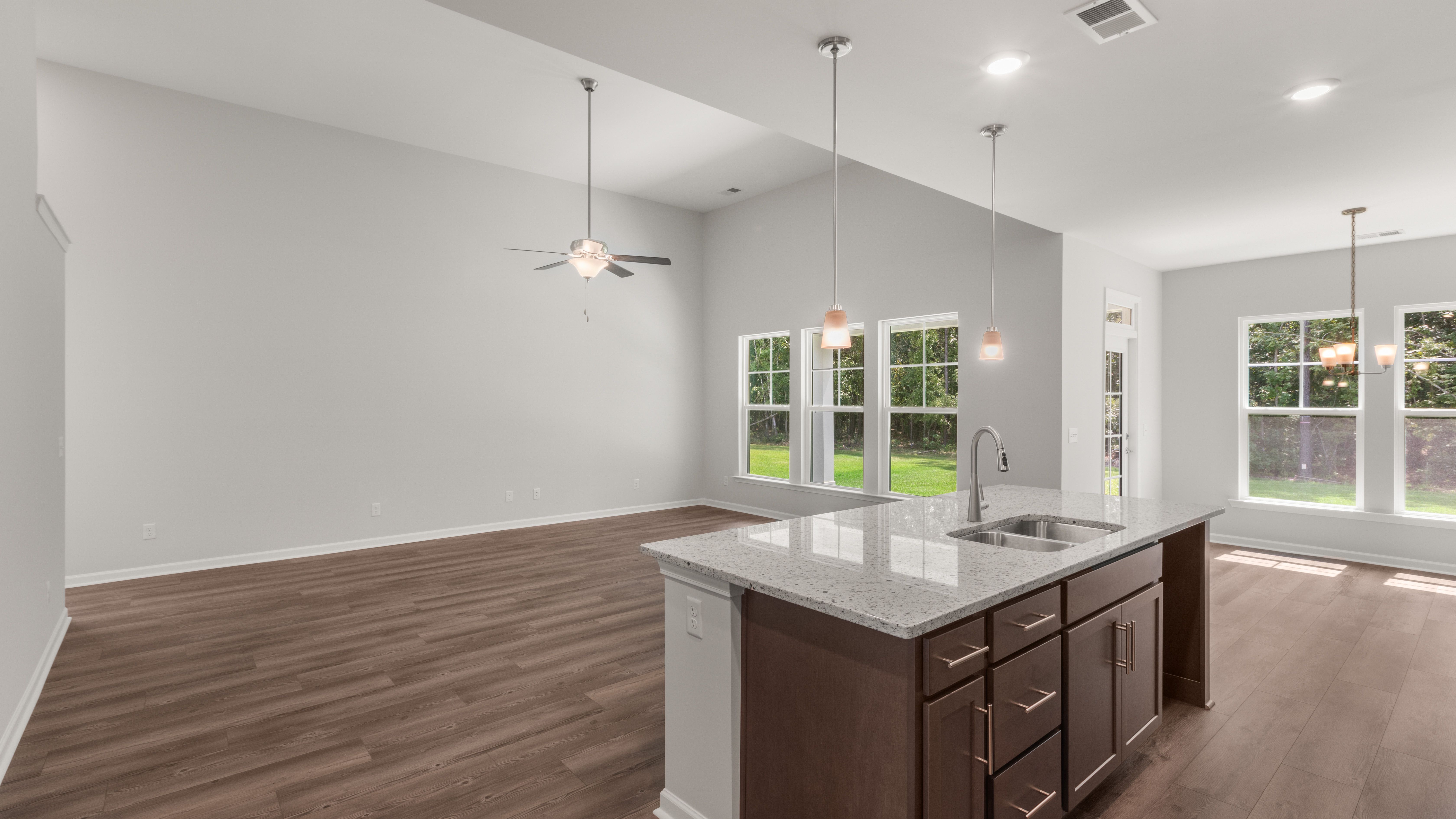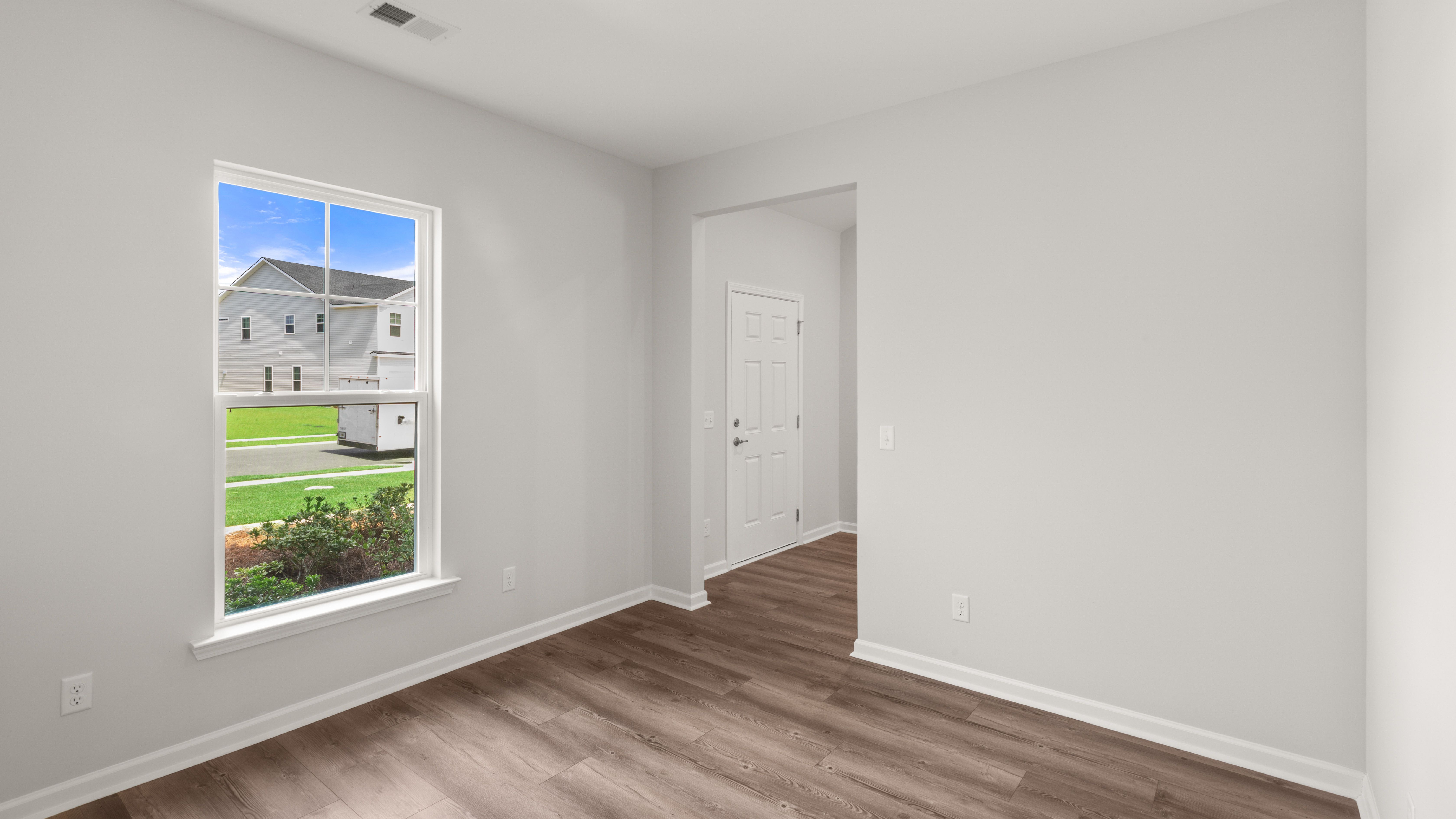 In the Stillwater, the primary suite is on the main floor, with a flex room that includes an option to be a den or study room. The second floor provides three bedrooms three additional bedrooms with a full bath. More features include a rear porch, two-car garage, and a spacious kitchen, dining, and living room concept.