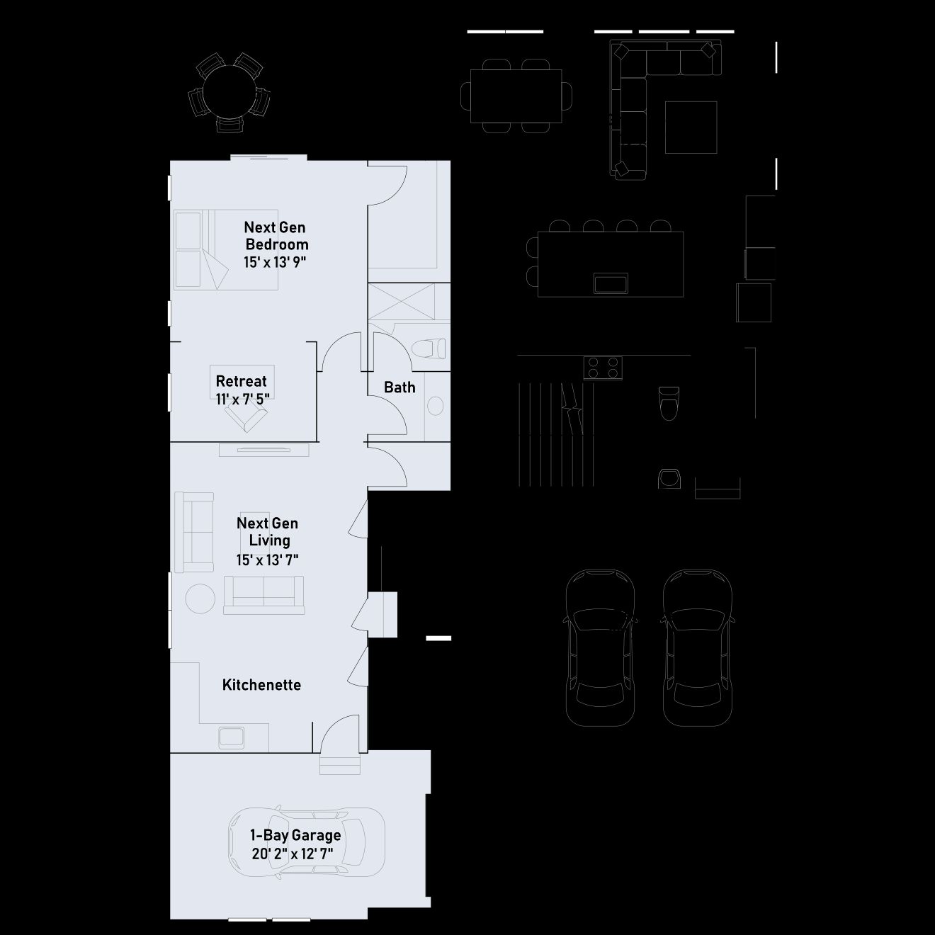 A Next Gen® home design, this plan features an attached suite with a personal entry, living area, kitchenette, bedroom, bathroom and single-car garage that offers private living for a variety of arrangements. In the main home, the seamless first-floor living area opens directly to a rear deck, perfect for entertaining. Upstairs are a versatile loft, three bedrooms and the owner’s suite with a retreat.