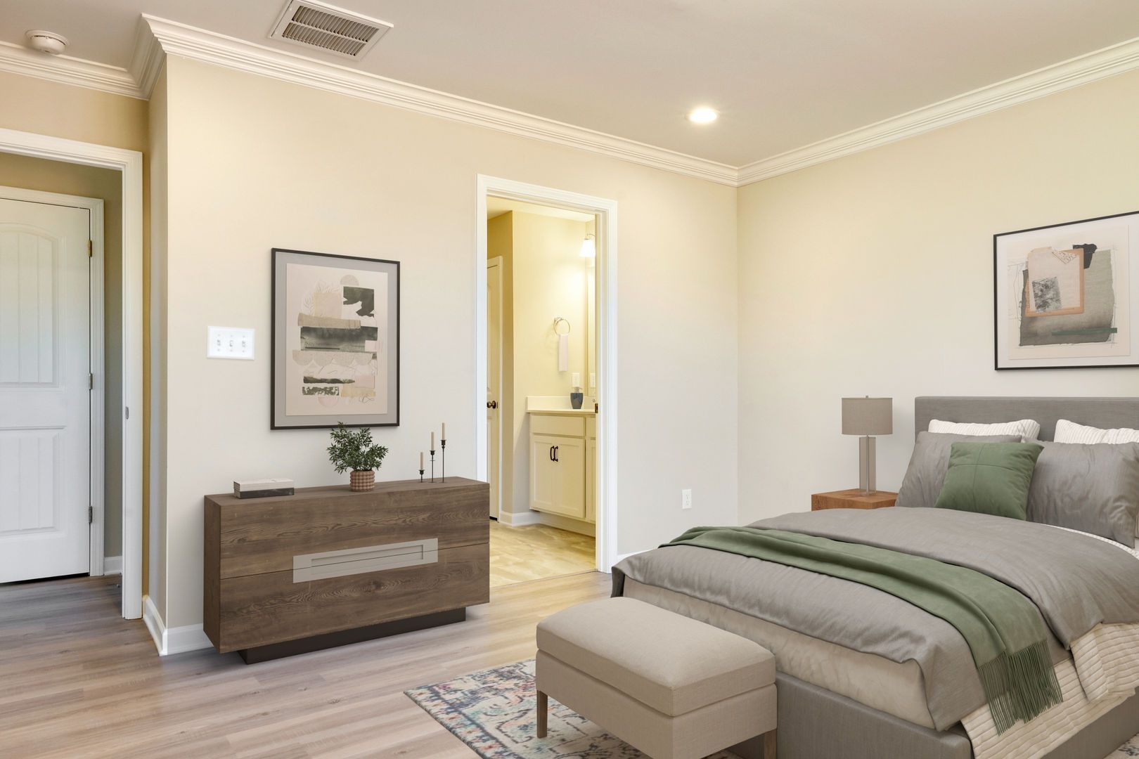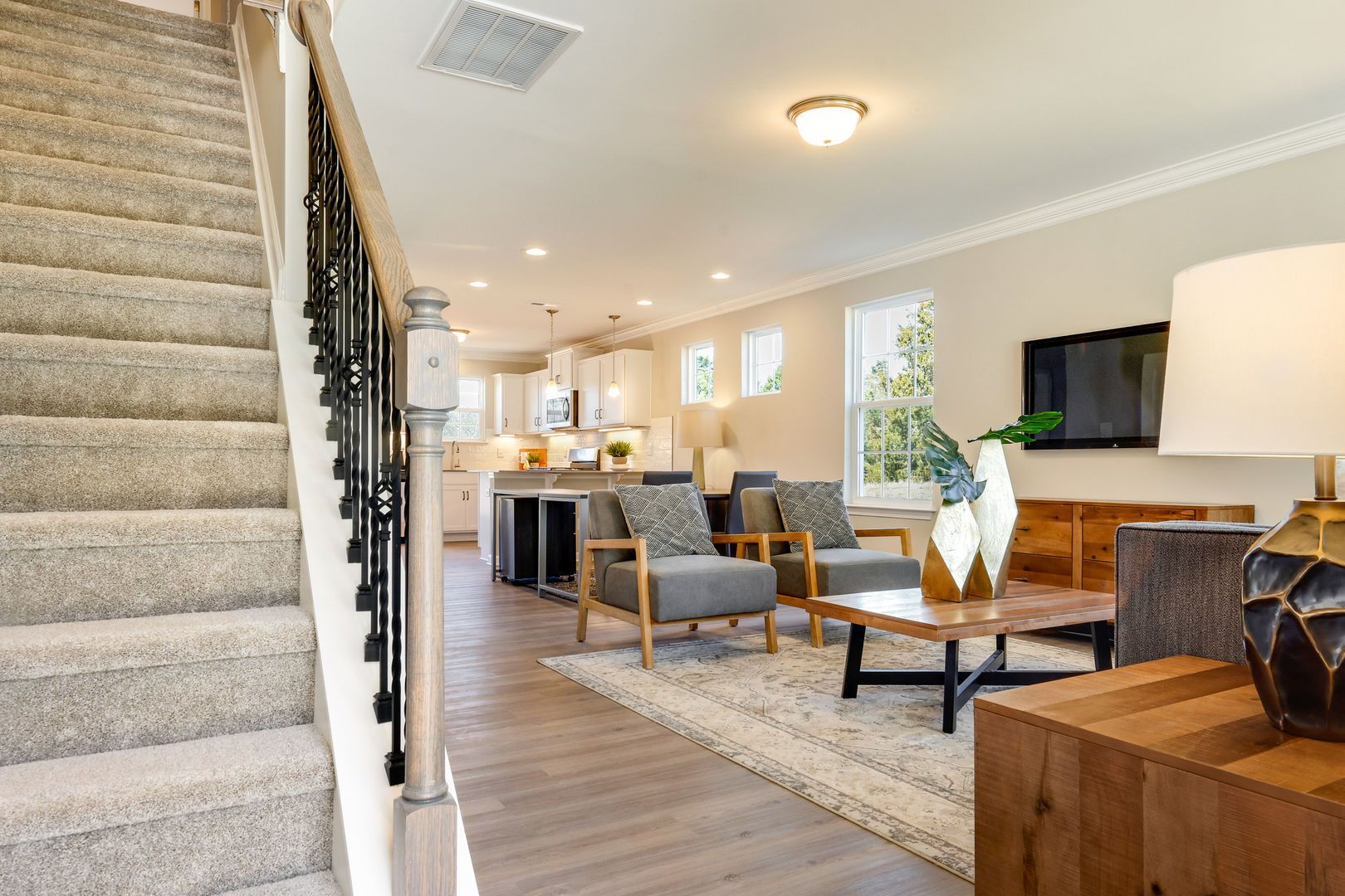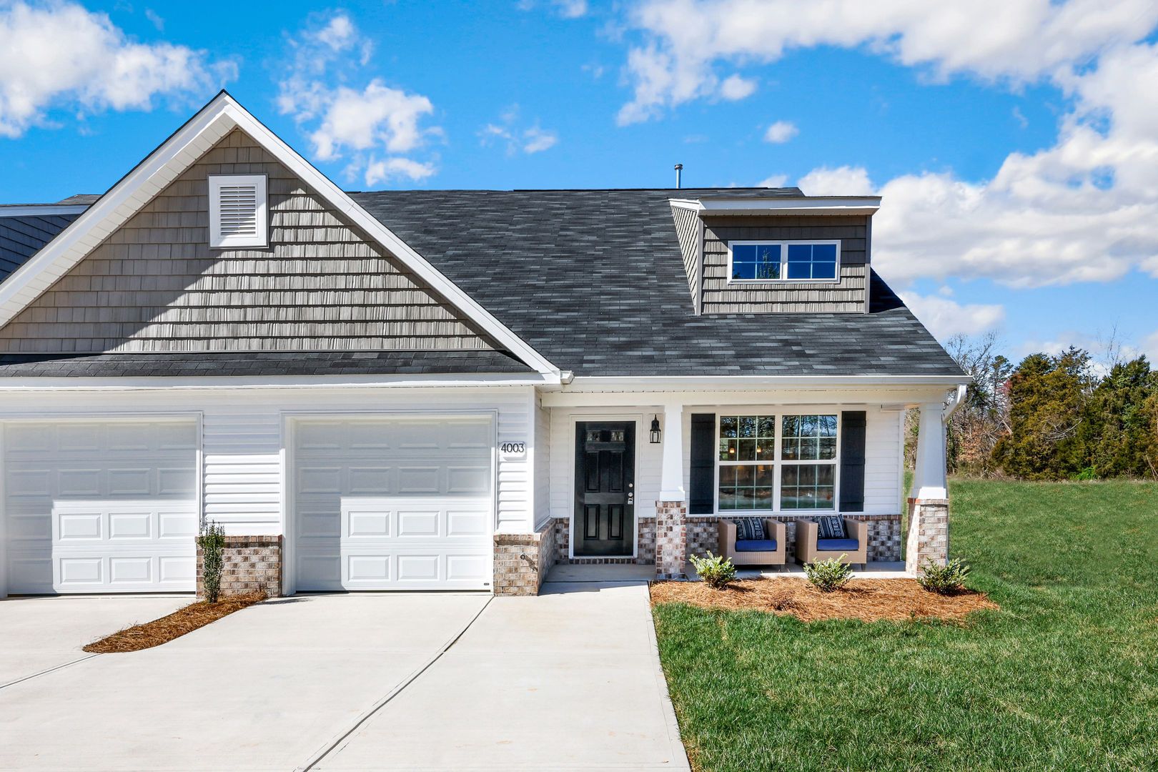 The Indiana is an end-unit townhome offering 3 bedrooms and 2.5 baths, including a primary suite on the main level. The second floor features two additional bedrooms, a full bath, a large loft, and a flex room suitable for office or storage use. Open kitchen with bar-height counter, dining area, and adjacent great room. One-car garage.