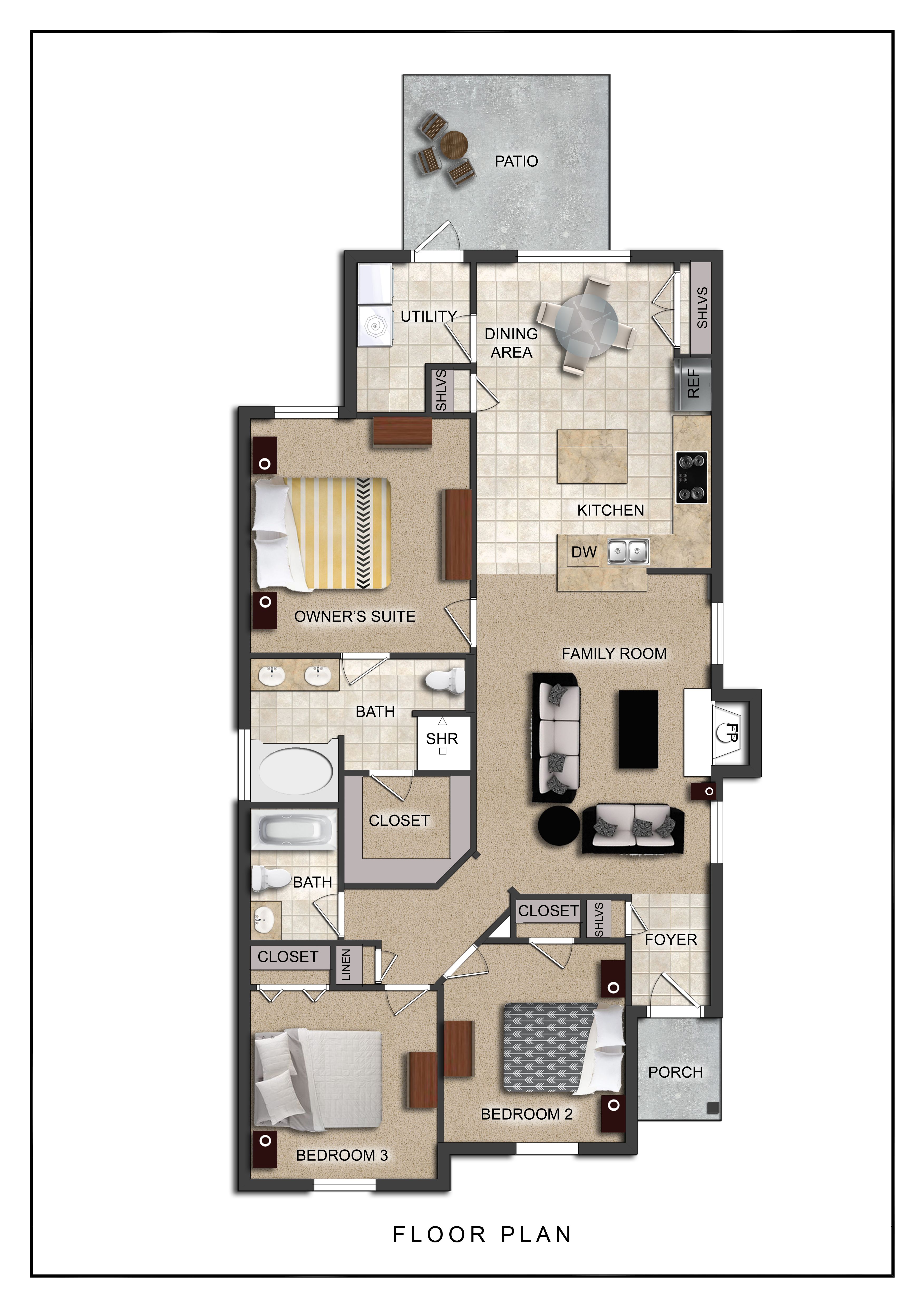 Presenting the Lilac floor plan: A modern take on a three-bedroom two-bathroom home. Style is in every square foot of this home with a separate owner’s suite that boasts a generous double sink vanity, separate soaking tub, and ample walk-in closet space. The Lilac’s well-designed eat-in kitchen offers generous counterspace for foodies and chefs alike as well as a breakfast bar that is perfect for quick breakfasts on the go or for serving meals while hosting. Spend your free time gathered around the wood burning fireplace in the living room or outside enjoying yourself on the poured concrete patio. There is no shortage of storage space in this well thought out floor plan, double doored pantry space is in the eat in kitchen, there’s sizable closets in each spare bedroom, and a hallway linen ...