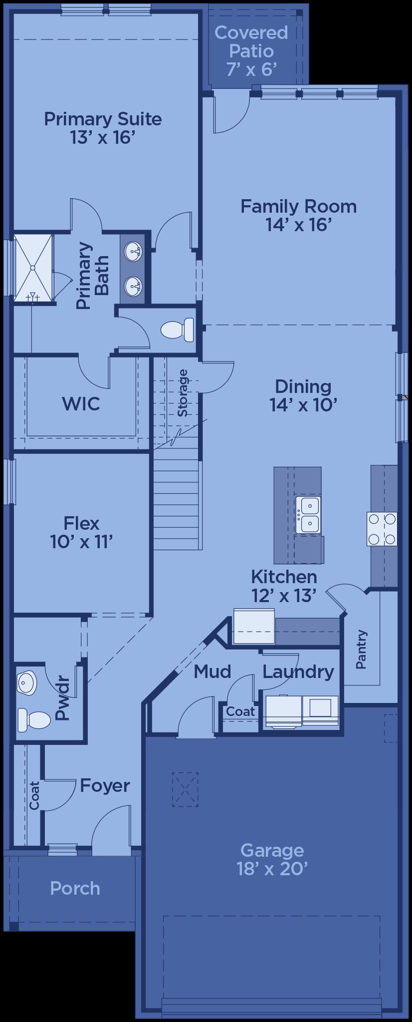 The Tucker offers a flexible and spacious layout perfect for modern living. The foyer leads to a cozy powder room and a multi-purpose flex room—ideal as a study, guest space, or home office. The open-concept kitchen features bar seating, ample counter space, a walk-in pantry, and flows into the dining area and large living room with access to a covered patio. The main-floor primary suite includes a luxurious bath with dual vanities, soaking tub, glass shower, and walk-in closet. Upstairs, a loft overlooks the living area and connects to two secondary bedrooms with walk-in closets, a linen closet, and shared full bath. Additional highlights include a two-car garage with direct access to the mudroom, laundry, and coat closet.