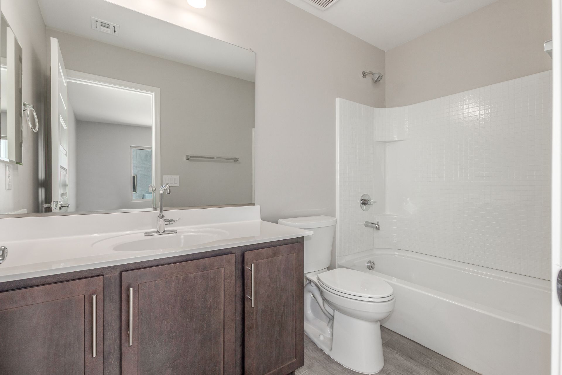 These C units are the largest in the community and have 4 bedrooms, each with its own ensuite bathroom. One of the 4 bedrooms is also downstairs which is highly uncommon in townhomes. Whether you have a parents or adult children that lives with you, or if you have visitors the bedroom downstairs gives them space within your house without being in the personal space upstairs. This unit has both a great room downstairs as well as a loft upstairs for entertaining or just relaxing after a long day at work. Each of the C units, just like the A and B units, are finished with one of two packages -white cabinets with a more brown toned wood plank tile, or darker stained cabinets with a more grey toned wood plank tile. Both packages are also finished with a white quartz counter top, two tone pa...