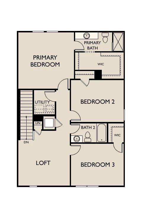 Step into your next home through the foyer from the front porch and continue down the hall to the main living space, passing a convenient powder bath along the way. The kitchen, dining area, and family room form an open-concept space, with stairs to the second floor nearby and access to the two-car garage just off the kitchen. Upstairs, a loft connects two additional bedrooms—one with a walk-in closet—that share a bath. As you head toward the primary bedroom, you’ll pass the laundry room before arriving at the spacious primary suite, complete with a walk-in closet and private primary bath.